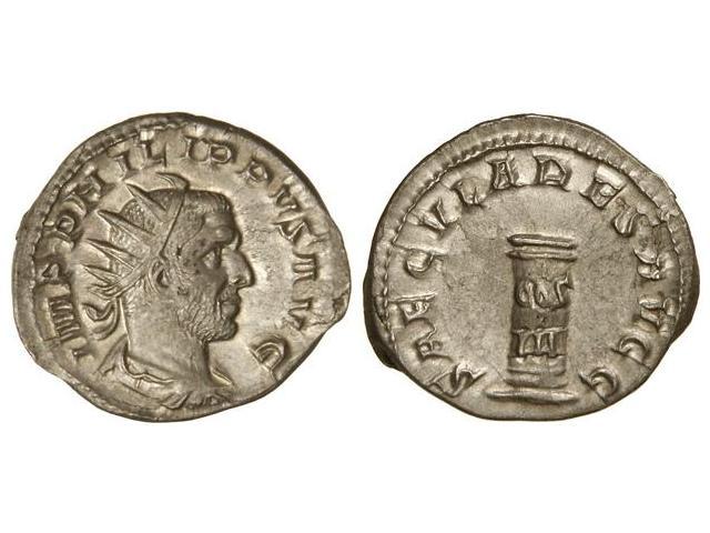 Antoniniano. Acuñada el 248 d.C. FILIPO I. Rev.: SAECVLARES AVGG. Pedestal con la inscripción COS III. 3,60 grs. AR. C-193. EBC/EBC-.