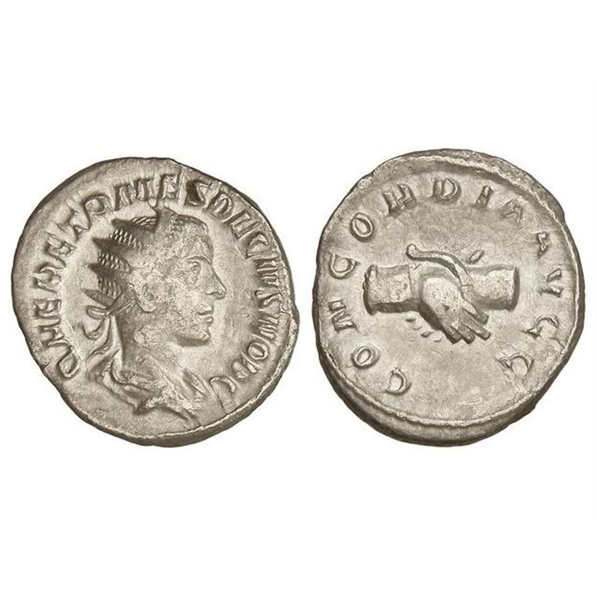 Antoniniano. - Acuñada el 250-251 d.C. - HERENNIO ETRUSCO. - Rev.: CONCORDIA AVGG. Manos enlazadas. 3,10 grs. AR. C-4. MBC. - -