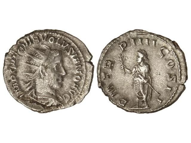Antoniniano. Acuñada el 253 d.C. VOLUSIANO. Rev.: P. M. TR. P. IIII COS. II. Volusiano en pie a izquierda con cetro y rama. 3,50 grs. AR. C-92. MBC/MBC+.