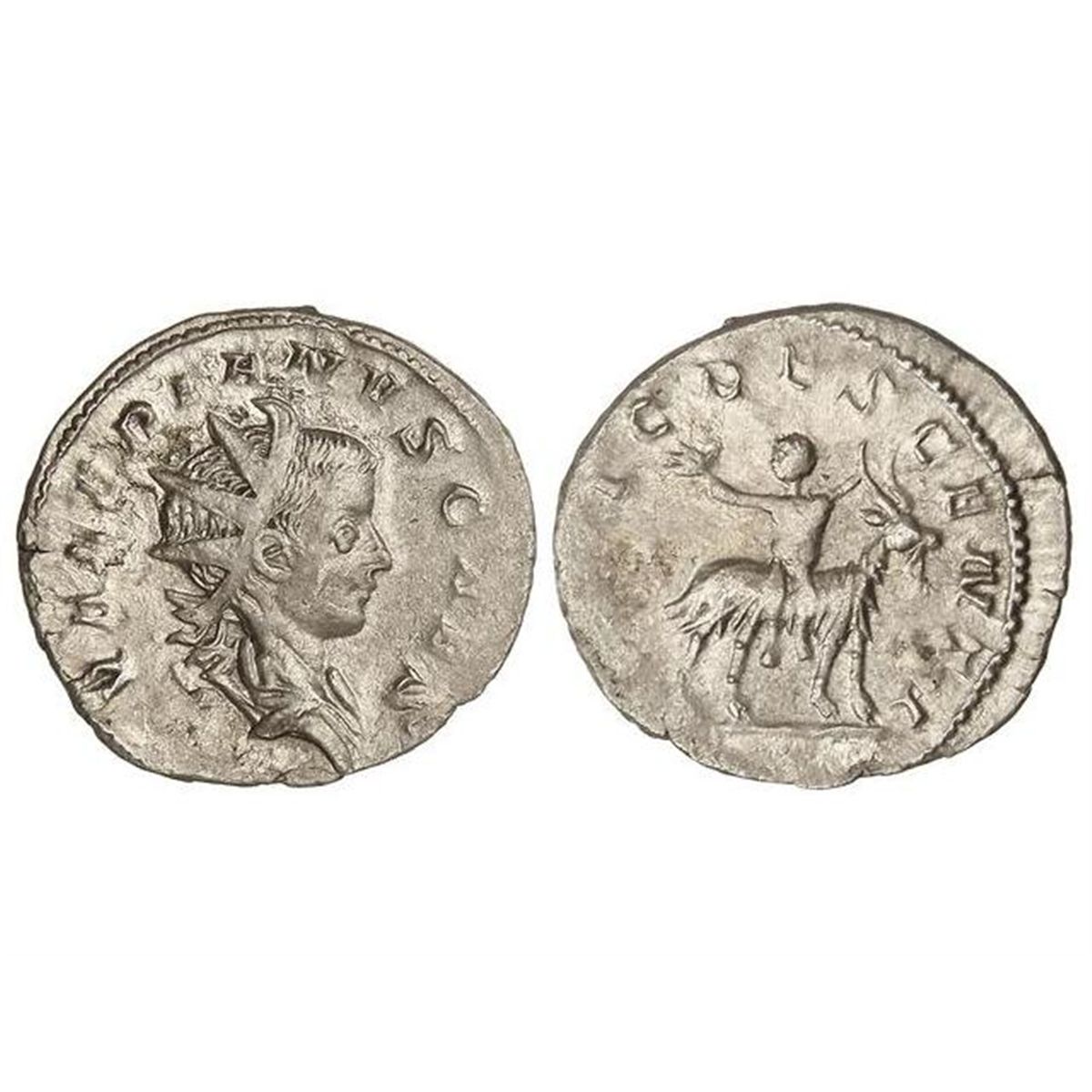 Antoniniano. - Acuñada el 255 d.C. - VALERIANO II. - Rev.: (IOV)I CRESCENTI. Júpiter niño a lomos de la cabra Amaltea en marcha a derecha. 2,80 grs. AE. C-26. MBC. - -