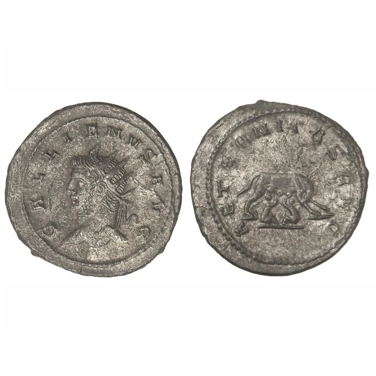 Antoniniano. - Acuñada el 260-268 d.C. - GALIENO. - Rev.: AETERNITAS AVg. Loba a derecha amamantando a Rómulo y Remo. 4,20 grs. Ve. C-46. EBC-. - -