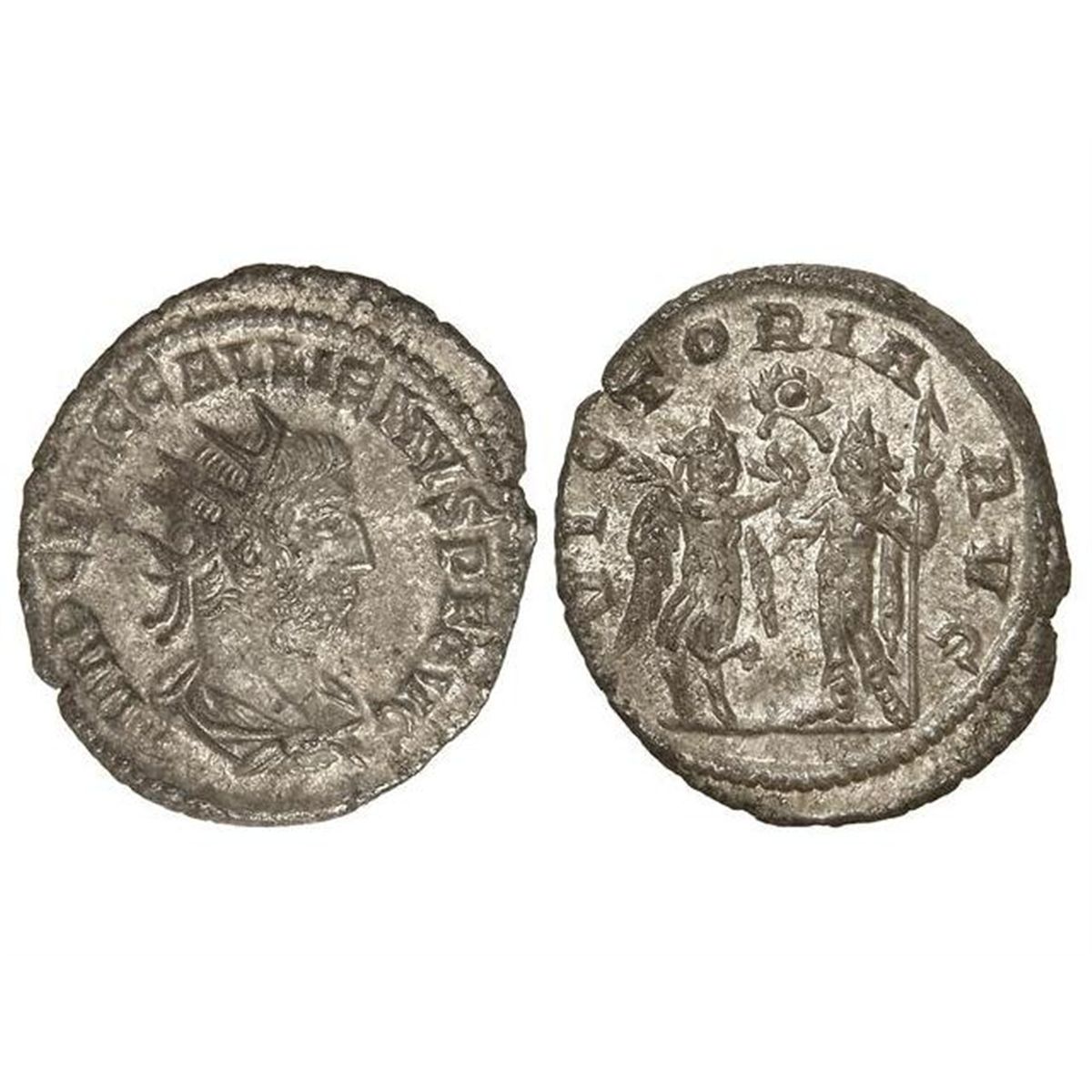 Antoniniano. - Acuñada el 260-268 d.C. - GALIENO. - Rev.: VICTORIA AVG. Galieno y Victoria en pie frente a frente. 3,90 grs. Ve. C-1109. EBC-. - -