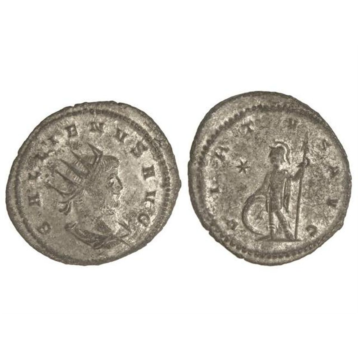 Antoniniano. - Acuñada el 260-268 d.C. - GALIENO. - Rev.: VIRTVS AVG. Marte en pie a izquierda con lanza y apoyado en un escudo. 3,50 grs. AE. (Plateado original). C-1237. MBC+. - -