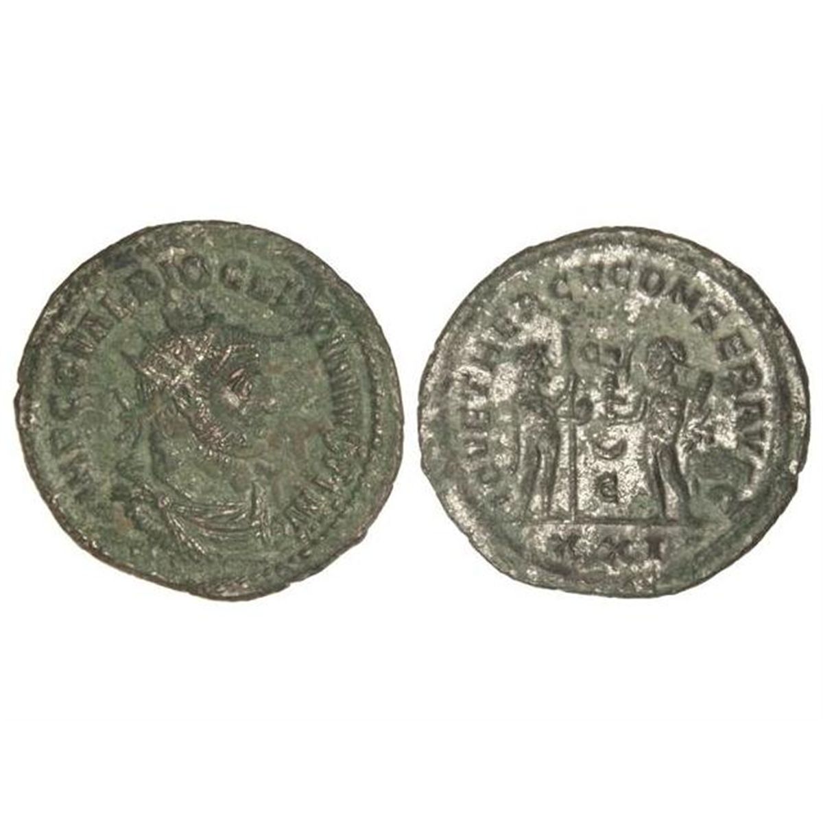 Antoniniano. - Acuñada el 285 d.C. - DIOCLECIANO. - Rev.: IOV. ET. HERCV. CONSER. AVGG. En exergo: XXI. Júpiter en pie a derecha, frente a Hércules. 4,10 grs. AE. Restos de plateado original. (Oxidaciones). C-146. MBC+/EBC-. - -