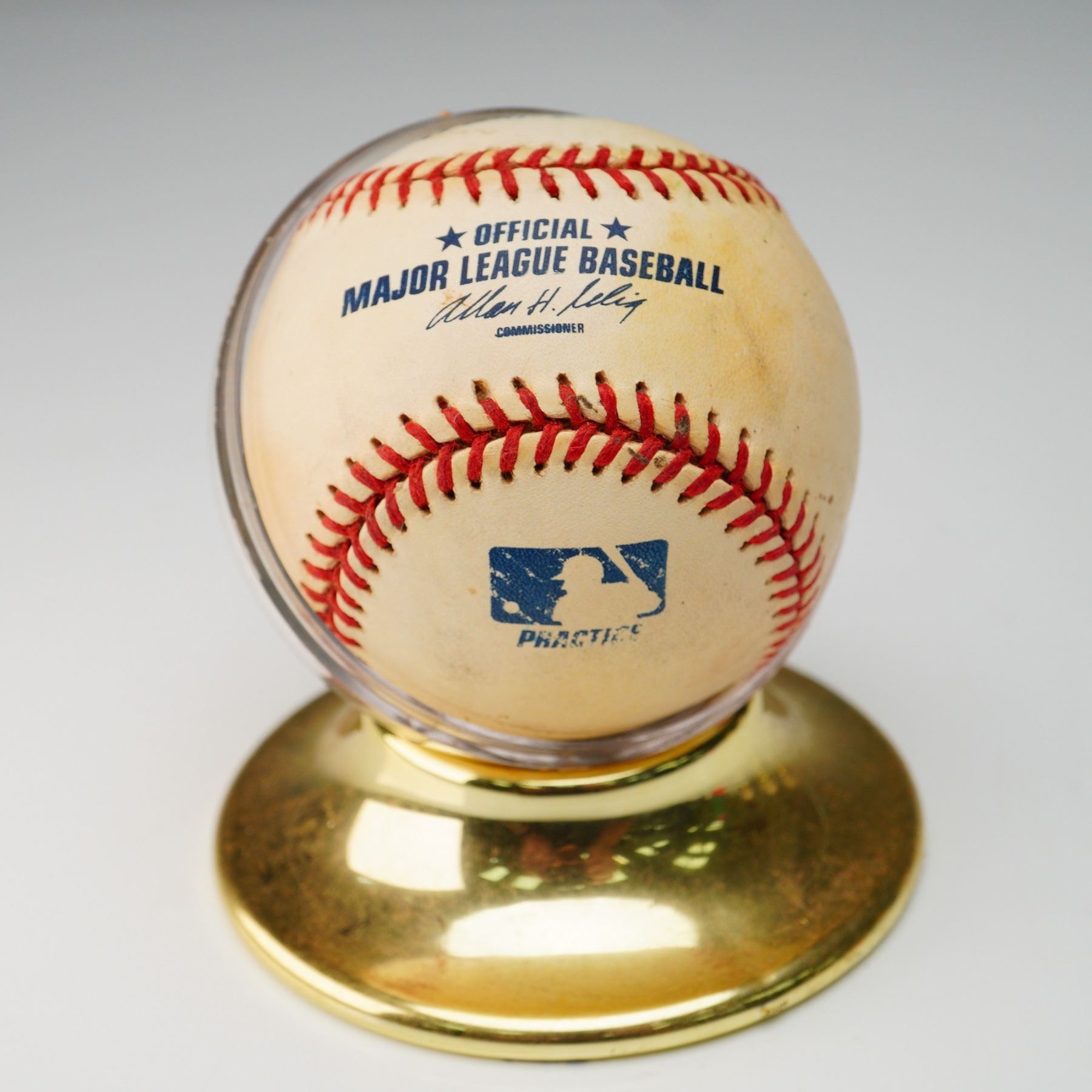 Official Rawlings Major League Baseball, sanctioned for practice use and issued under the commissionership of Allan H. Selig. the signed baseball features the autograph of renowned relief pitcher Antonio AlFonseca. applied in faded brown ink, appears on a well worn panel of the leather surface, Displayed in a rounded acrylic case with a gold finished pedestal.