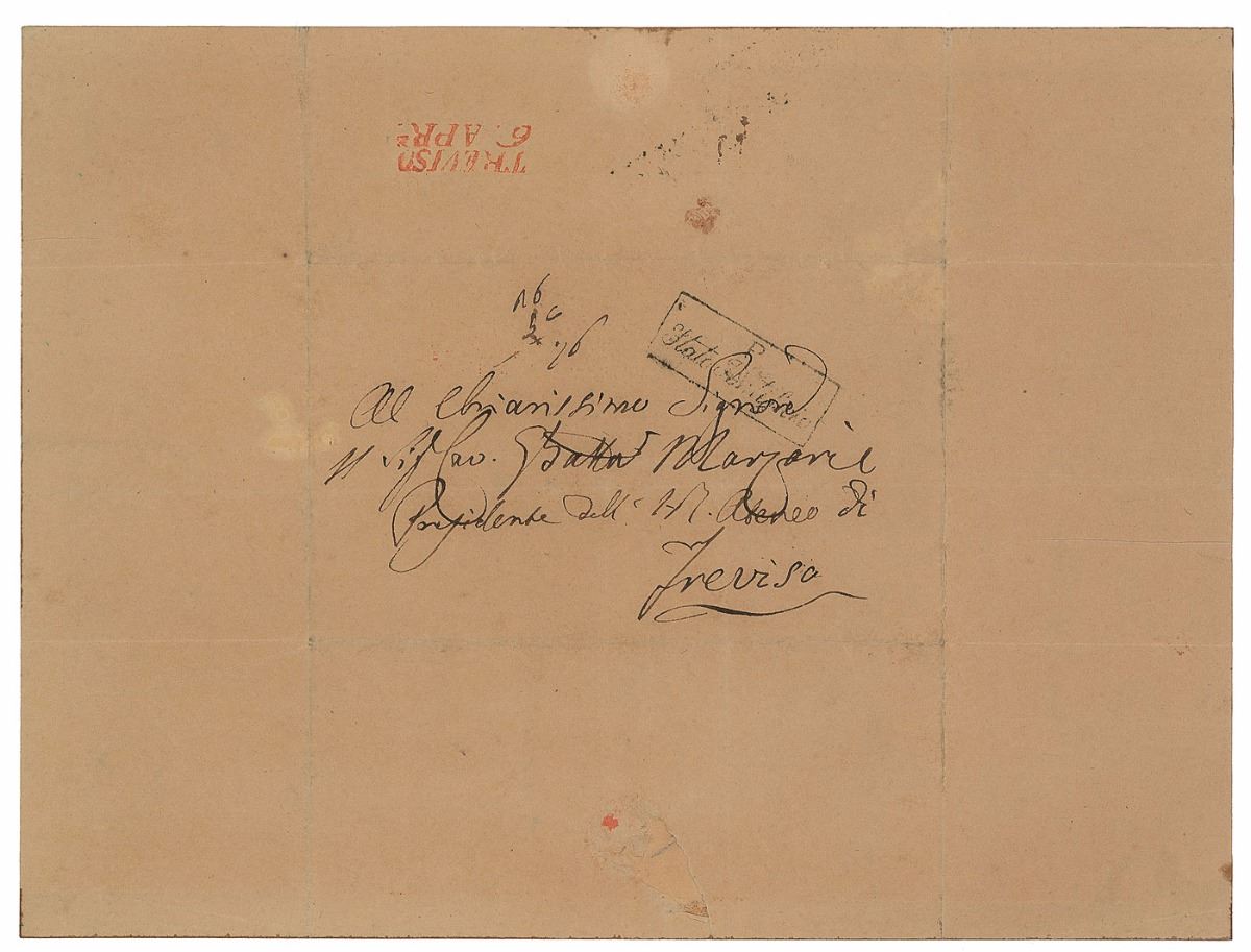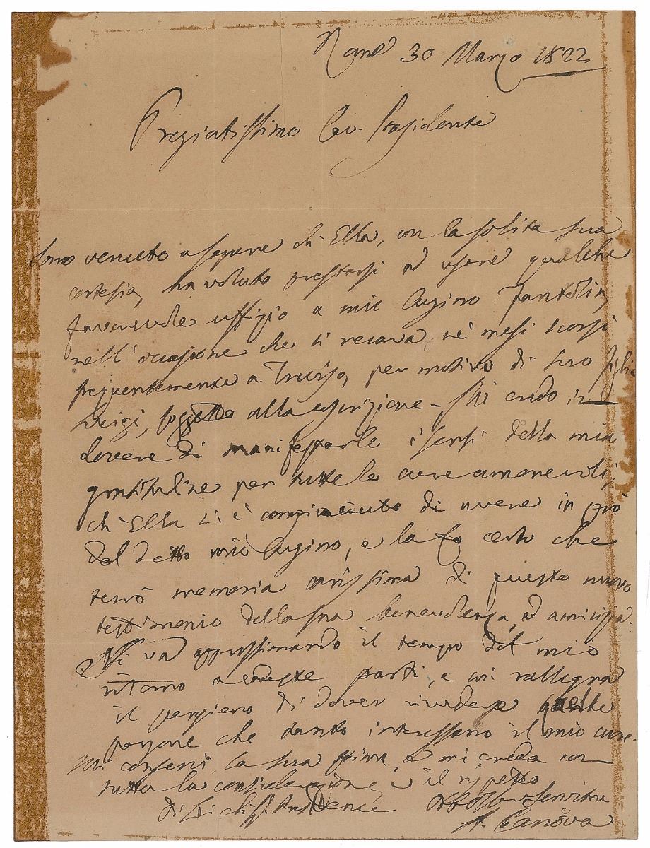 Italian sculptor (1757–1822) known for his neoclassical marble nudes. ALS in Italian, signed “A. Canova,” one page, 7.25 x 9.5, March 30, 1822. Untranslated letter to G. Batta Marzari, thanking him for renting an office to his cousin. Addressed on the reverse of the second integral page in Canova’s hand. In very good condition, with intersecting folds, overall wrinkling, and toned tape along the left and right edges. Accompanied by an unsigned engraving of Canova.