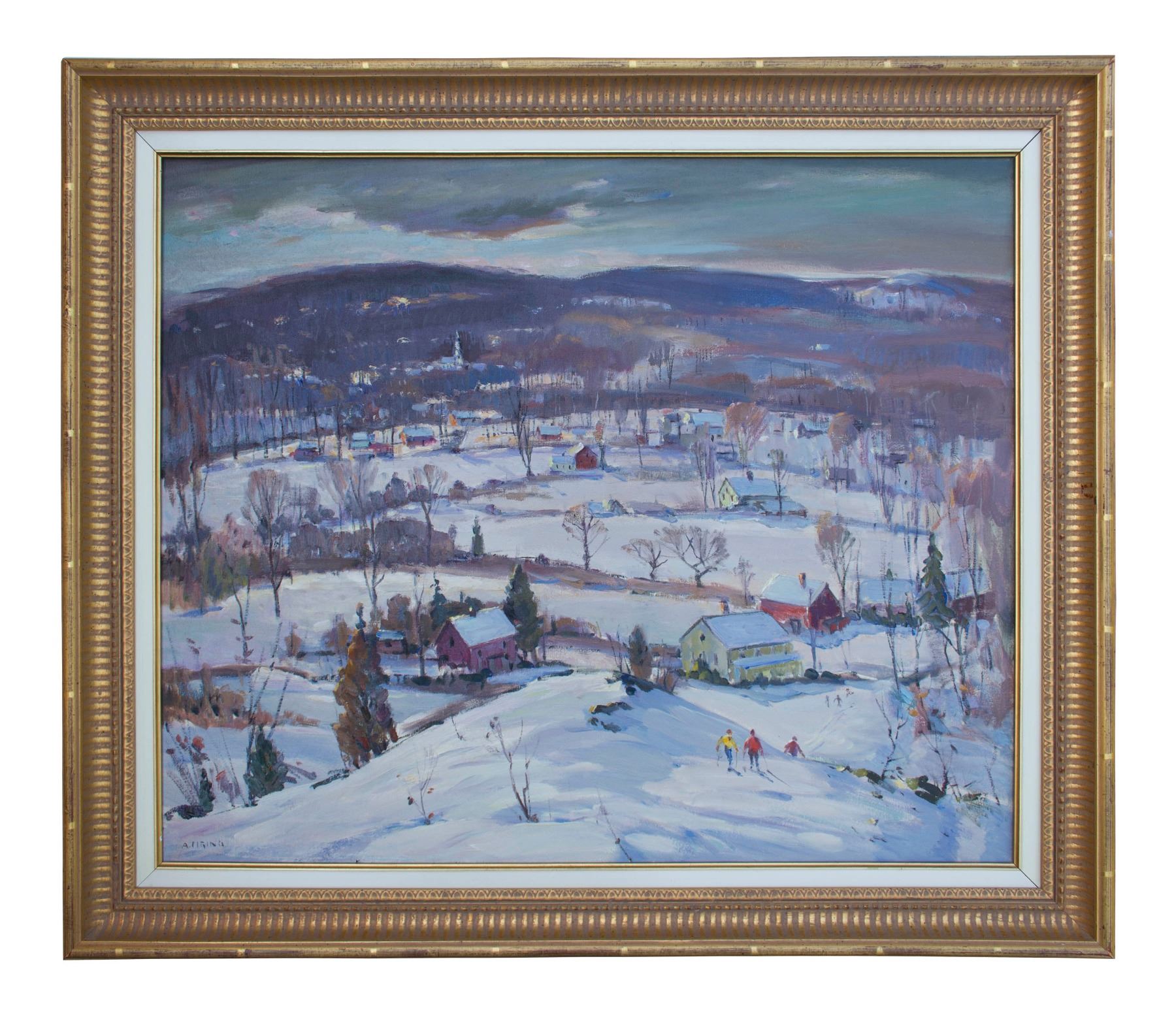 Antonio Cirino oil on canvas, providing an aerial view of a winter scene in a sparse residential neighborhood. Painting is characteristic of the modern impressionist style of the Rockport School, of which Cirino was a prominent member. Signed ''A. Cirino'' at lower left. Measures 30'' x 25'', framed. Very good condition.