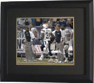 On July 25, 2006, Antonio Cromartie signed a 5-year, $13.5 million contract with $7.35 million guaranteed with the Chargers. In his first season with the Chargers, Cromartie saw action at cornerback and on special teams. Minnesota Vikings kicker Ryan Longwell came onto the field to attempt a 58-yard field goal to end the first half. The Chargers put Cromartie in the endzone to return the field goal in case of a missed kick. The field goal attempt missed the goalposts and fell toward the back of the endzone. Cromartie intercepted the football, came down with both feet in bounds, two inches from the back of the end zone, and began the return. Cromartie returned the missed field goal 109 yards for a touchdown at The Metrodome, setting a record for the longest play in NFL history. Antonio Cromartie has hand signed this San Diego Chargers 16x20 Photo. Cromartie Hologram and Certificate of Authenticity from Athlon Sports. Custom Black Mat and Premium Black Color Framed as shown