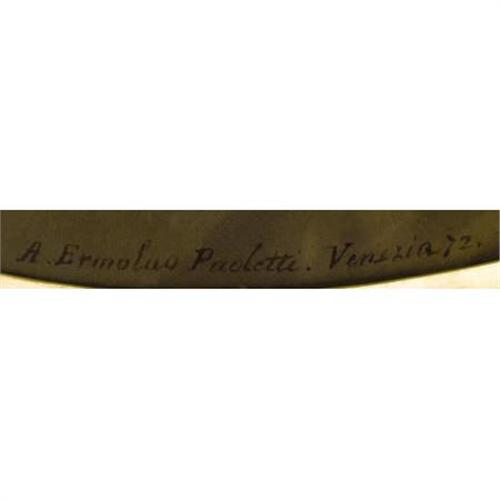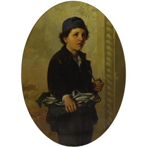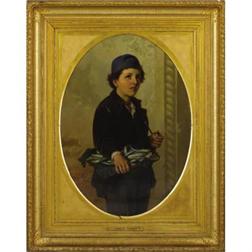 <B>ANTONIO ERMOLAO PAOLETTI </B></I>(Italian 1834-1912)<BR><I>Young Boy with Fish</B></I>, 1872<BR>Oil on canvas<BR>38-1/2 x 28-1/4 inches (97.8 x 71.8 cm)<BR>Signed lower right: <I>A. Ermolao Paoletti, Venezia 72</B></I><BR> <BR>Provenance:<BR>Private Collection, San Antonio<BR><BR>Paoletti was known for his paintings of Venetian street vendors, usually young and impoverished. This model appears in several of his works.<BR><BR><b>Shipping:</b> Requires 3rd Party Shipping (<a target="_blank" href="http://www.heritageauctions.com/common/shipping.php">view shipping information</a>)