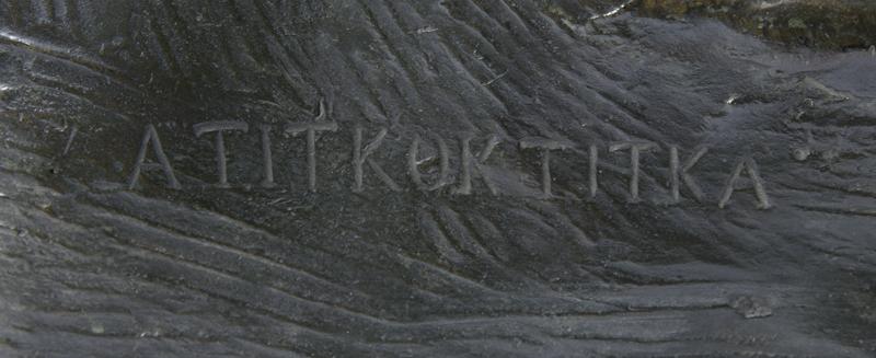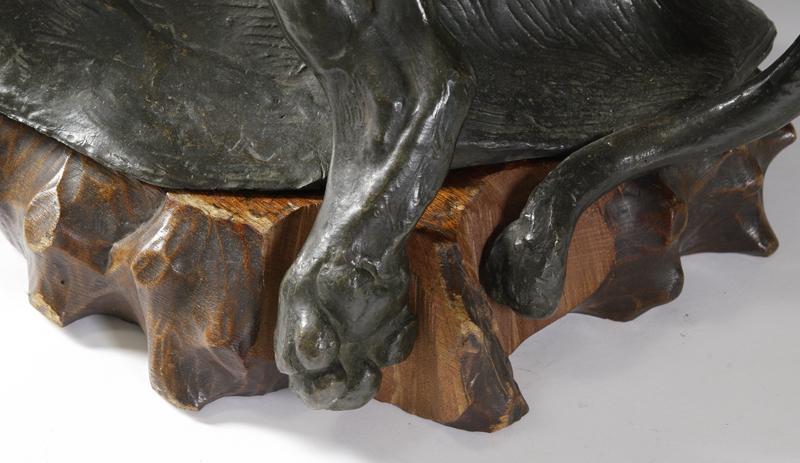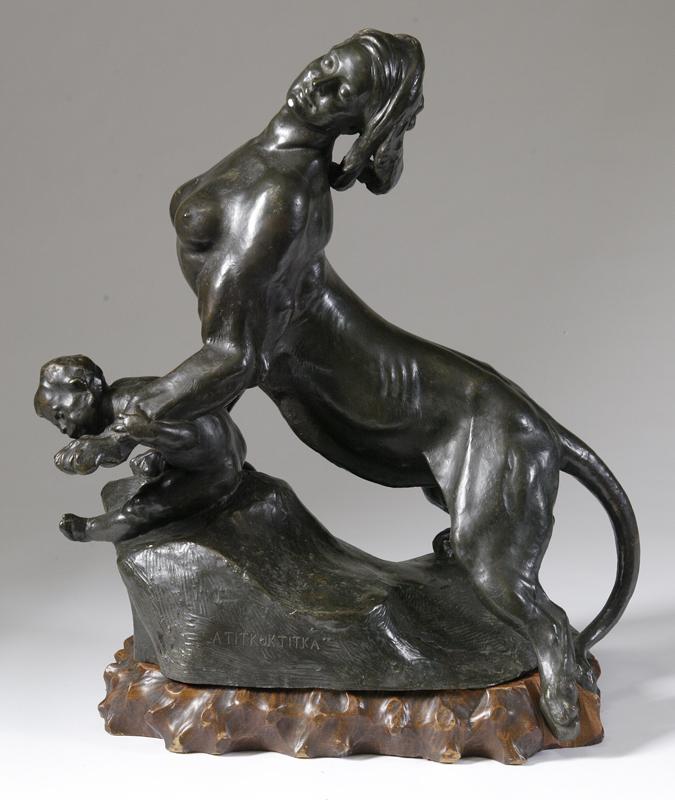 Antonio G. Lanzirotti (1839-1911/21) Italian. "Atlitya Goddess of the Forest, Protector of the Children." Depicting a woman's head with a panther body guarding a child under her paw. Signed in front near the base as well as "ATITKOKTITKA". 26" H x 24" W x 12" D. With custom fitted carved wood stand, 4" H. Chip to wooden base; bronze in excellent condition.