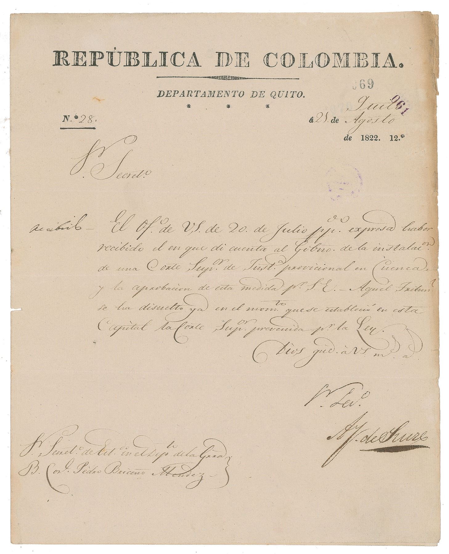 LS in Spanish, signed “A. J. de Sucre,” one page, 8 x 10, Republica de Colombia letterhead, August 21, 1822. Letter to Pedro Briceno Mendez, the Secretary of War and Navy, in part (translated): "The official letter of your Lordship of the 29th of July postal express has been received, the one in which is the account of the governor of the installation of a provincial Superior Court of Justice in Cuenca and approval of this measure by His Excellency. That tribunal has broken up already at the moment that it established in this capital the provincial Superior Court for the Law." In fine condition, with toning to the right edge.
