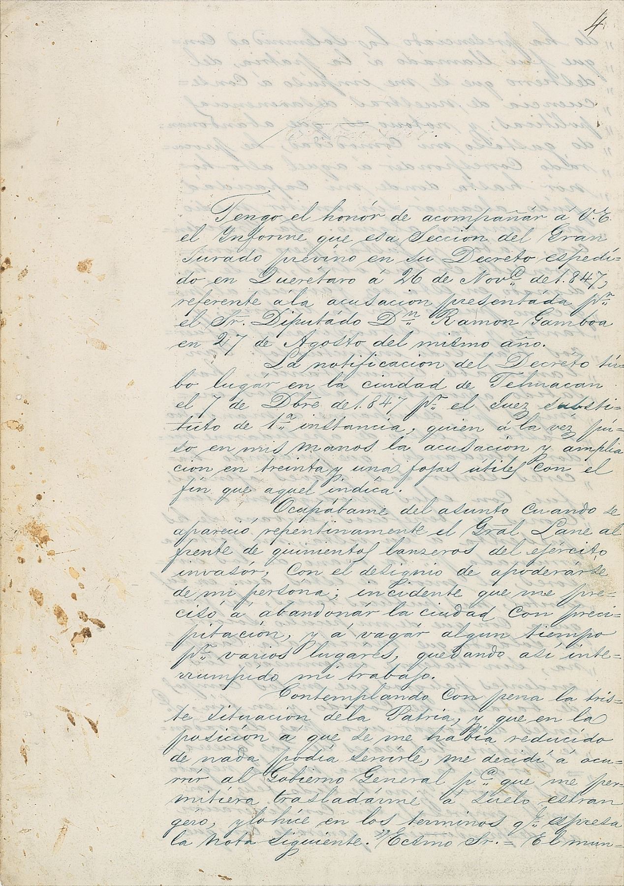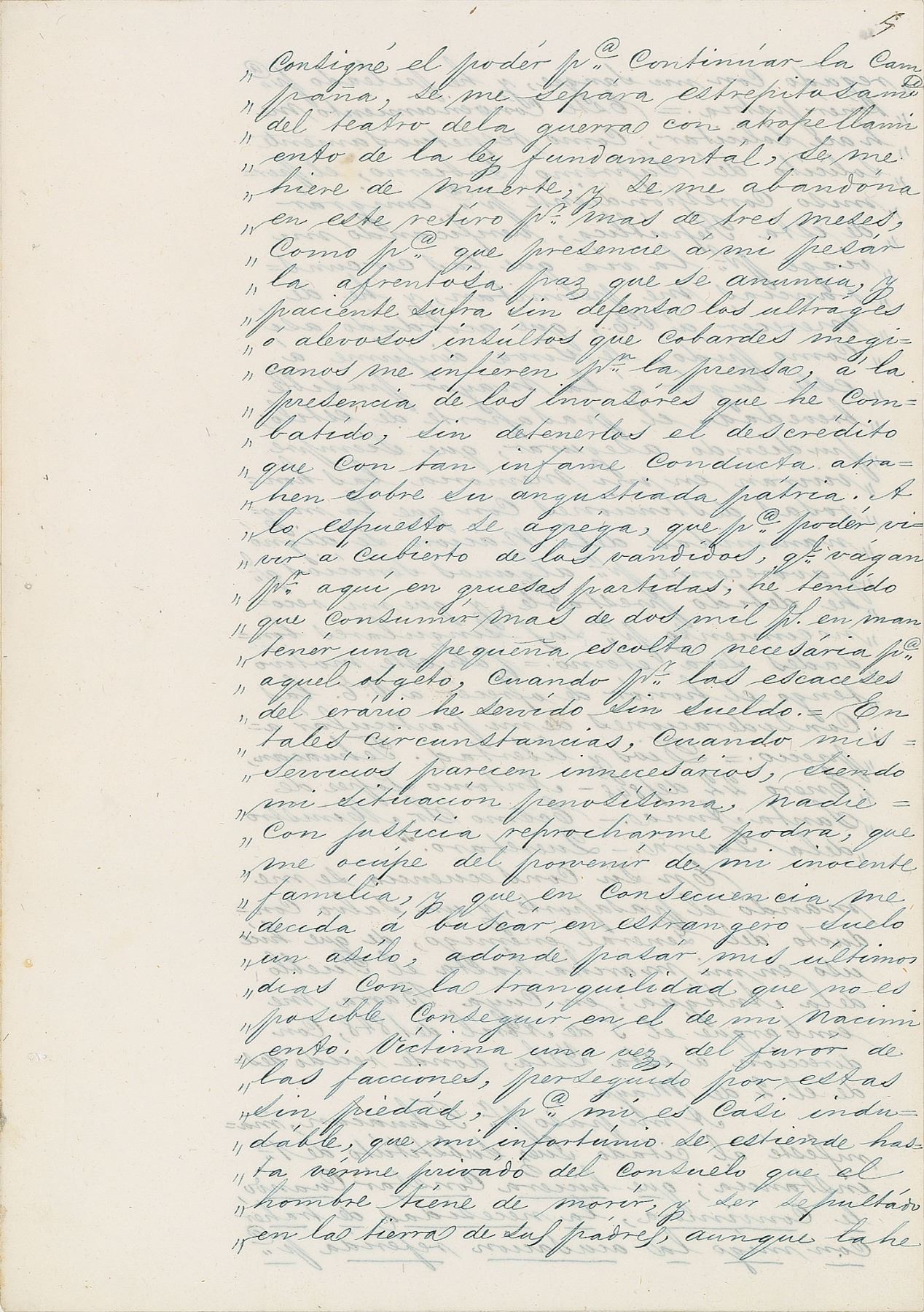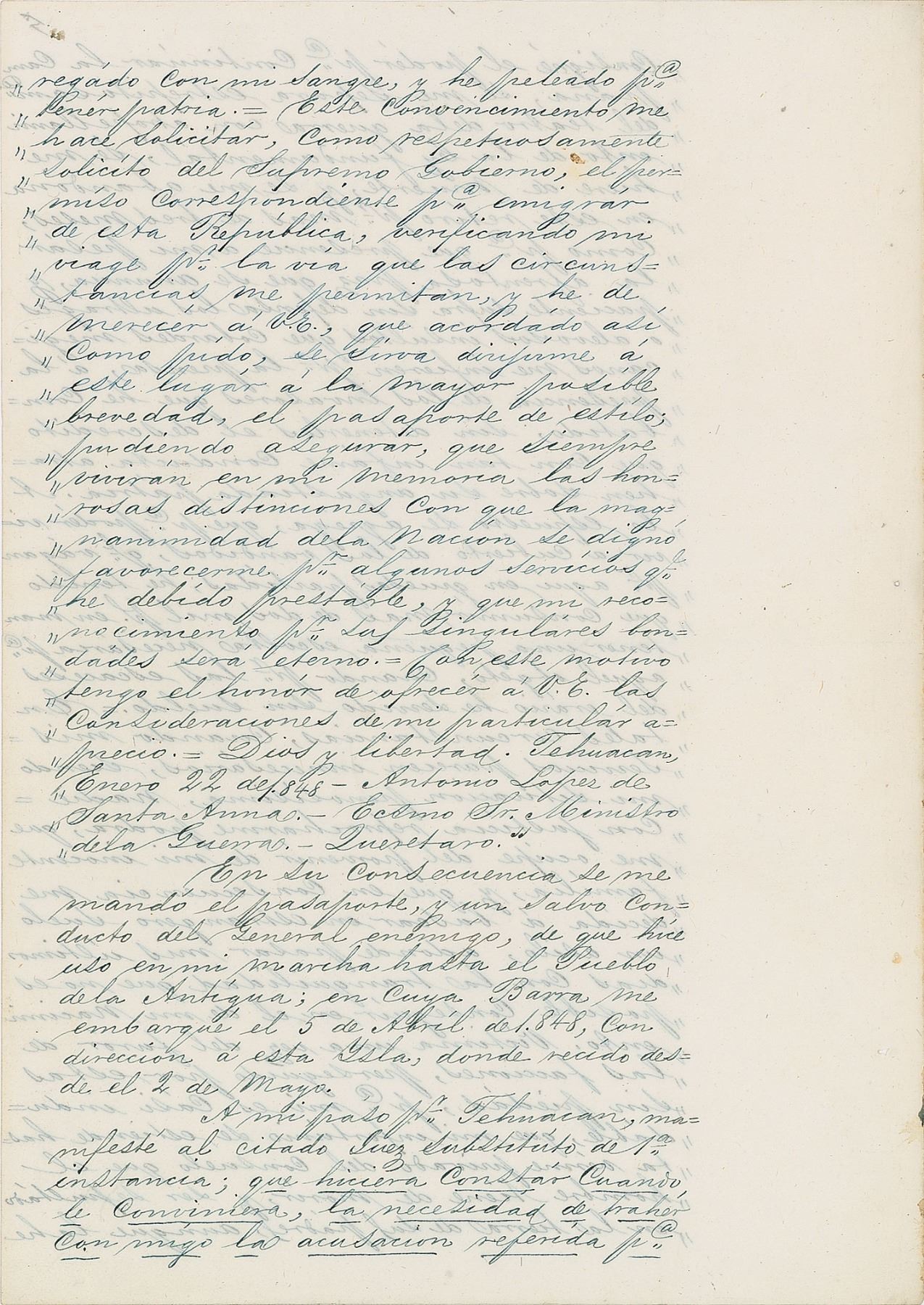 As it turned out, so as to be able to live under the protection of the bandits who roamed through here in sizeable parties, I had to spend more than two thousand pesos to maintain a small escort, which was necessary to this end, whereas by the cash reserves of the treasury I served without pay. In such circumstances, when my services seemed unnecessary, my situation being most deplorable, nobody could justifiably reproach me for tending to providing for my innocent family, and so in consequence I decided to look for asylum on foreign soil, where I would spend my last days in the tranquility which could not be found at all in that of my birth. A victim one time of the furor of factions, persecuted by them without mercy, for me it is almost indubitable that my misfortune extends to being deprived of the solace a man about to die needs, and to be insulted in the country of his fathers, even though I have spilled my blood on it and have fought to protect the fatherland. This conviction prompted me to apply, in respectfully soliciting the Supreme Government, for such permission to emigrate from this Republic, making my voyage by rout which circumstances will afford, and I must thank Y.E., should such request be granted, if the official passport can be dispatched to this place in the shortest possible time. I can assure you that the honorable distinctions with which the magnanimity of the nation has deigned to favor me for some services which I was obliged to render it will always live in my memory, and that my gratitude for your singular benevolence will be eternal. In this frame of mind, I have the honor to offer Y.E. the consideration of my particular appreciation. God and liberty, Tehuacan, January 22, 1848—Antonio Lopez de Santa Anna.—Est.’d Sr. the Minister of War.—Queretaro.'