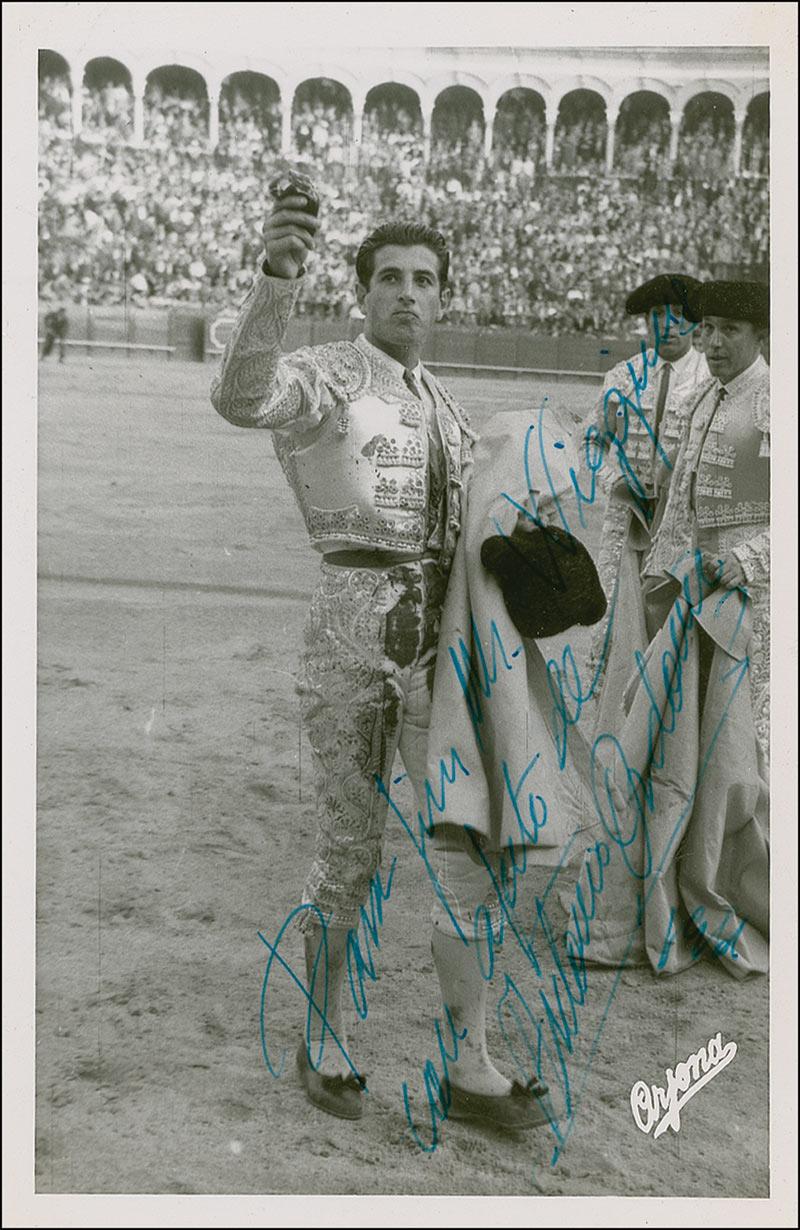 Famous bullfighter (1932-1998) who was a long time friend with Ernest Hemingway. Hemingway wrote an account of Ordonez's rivalry with the matador Luis Miguel Dominguin (also Ordonez's brother in law) titled The Dangerous Summer. Vintage glossy 4.75 x 7.25 photo of Ordonez acknowledging a capacity crowd, signed and inscribed in fountain pen in Spanish and dated 1961. In fine condition, with a few scattered edge and corner creases.