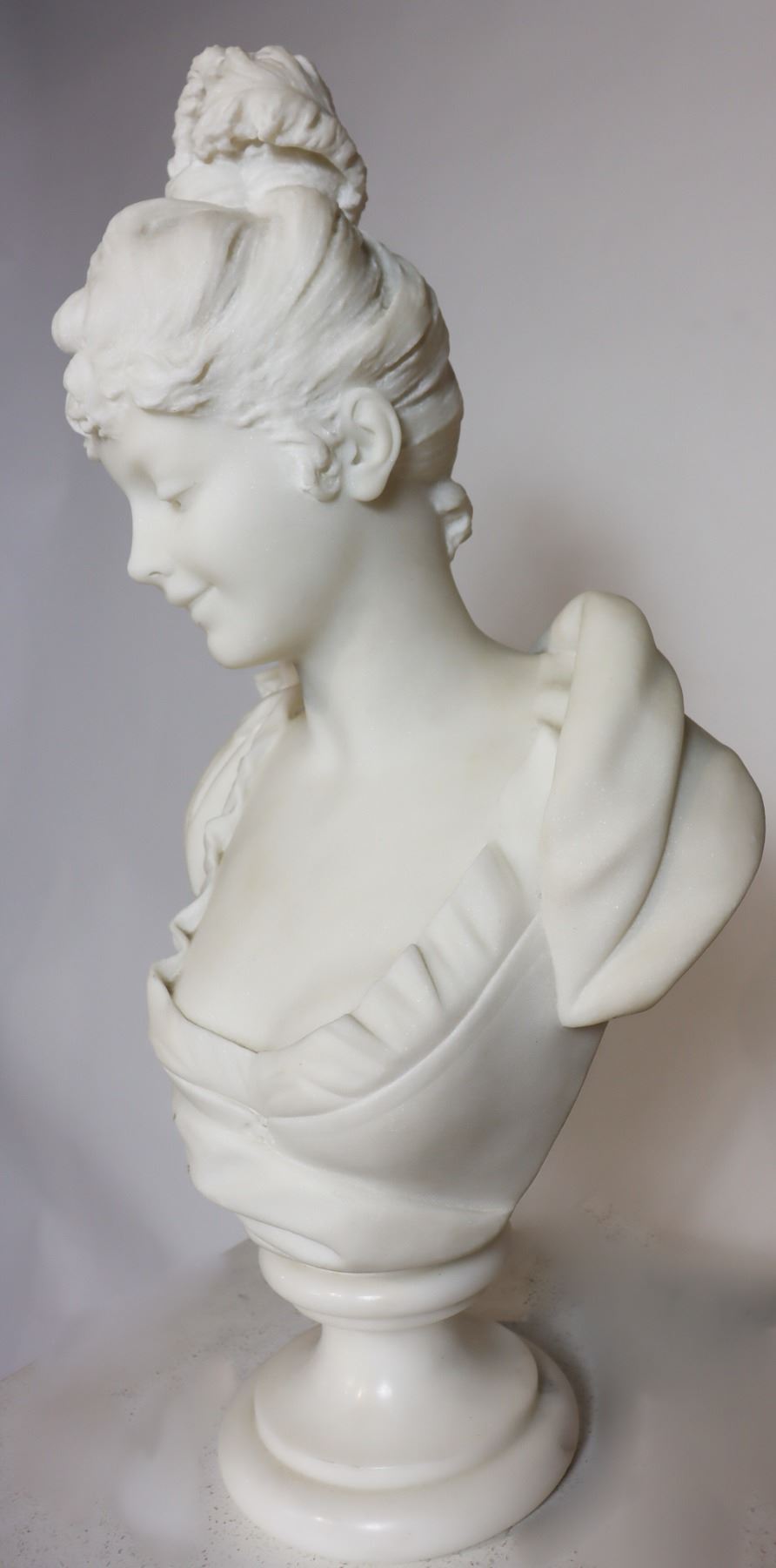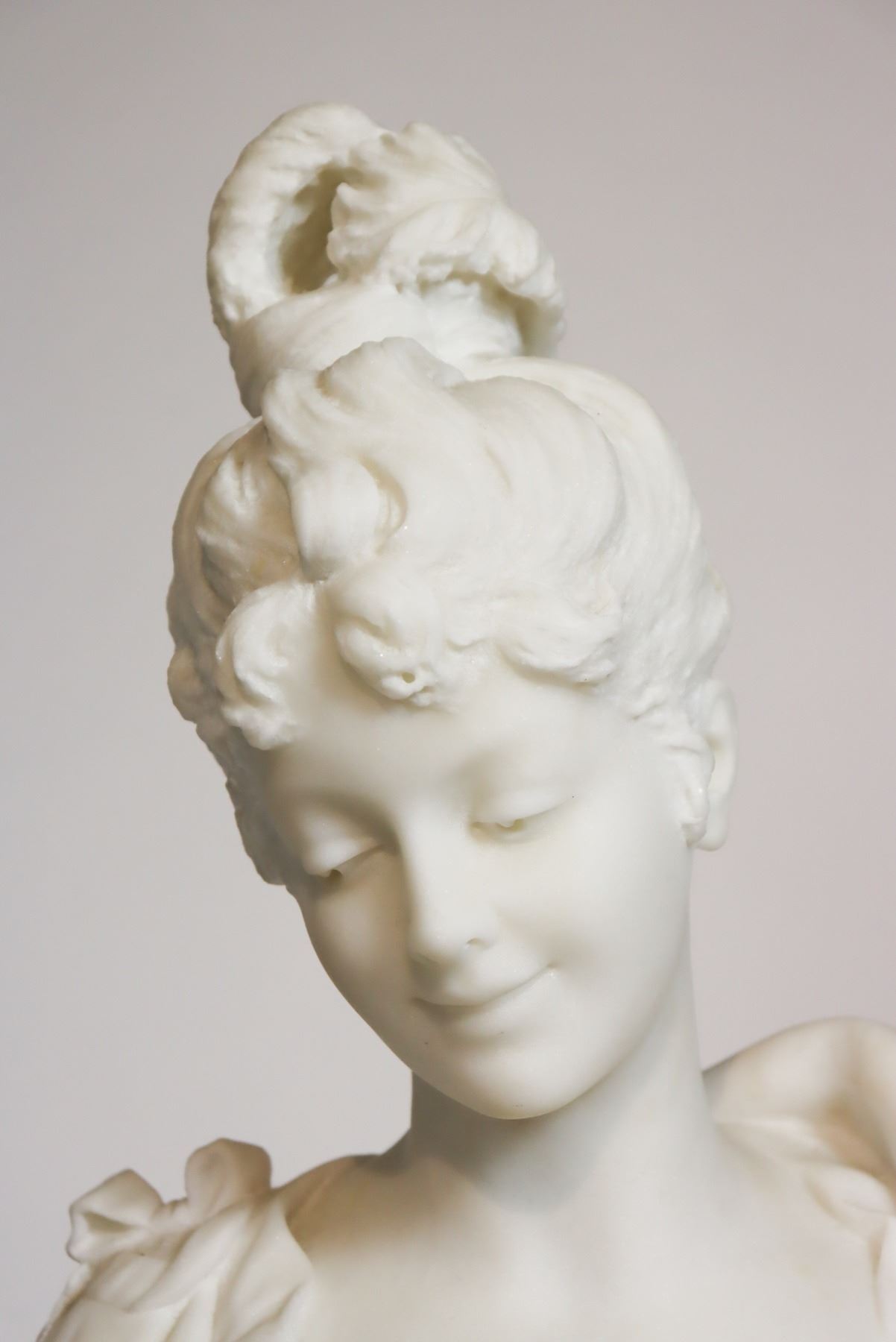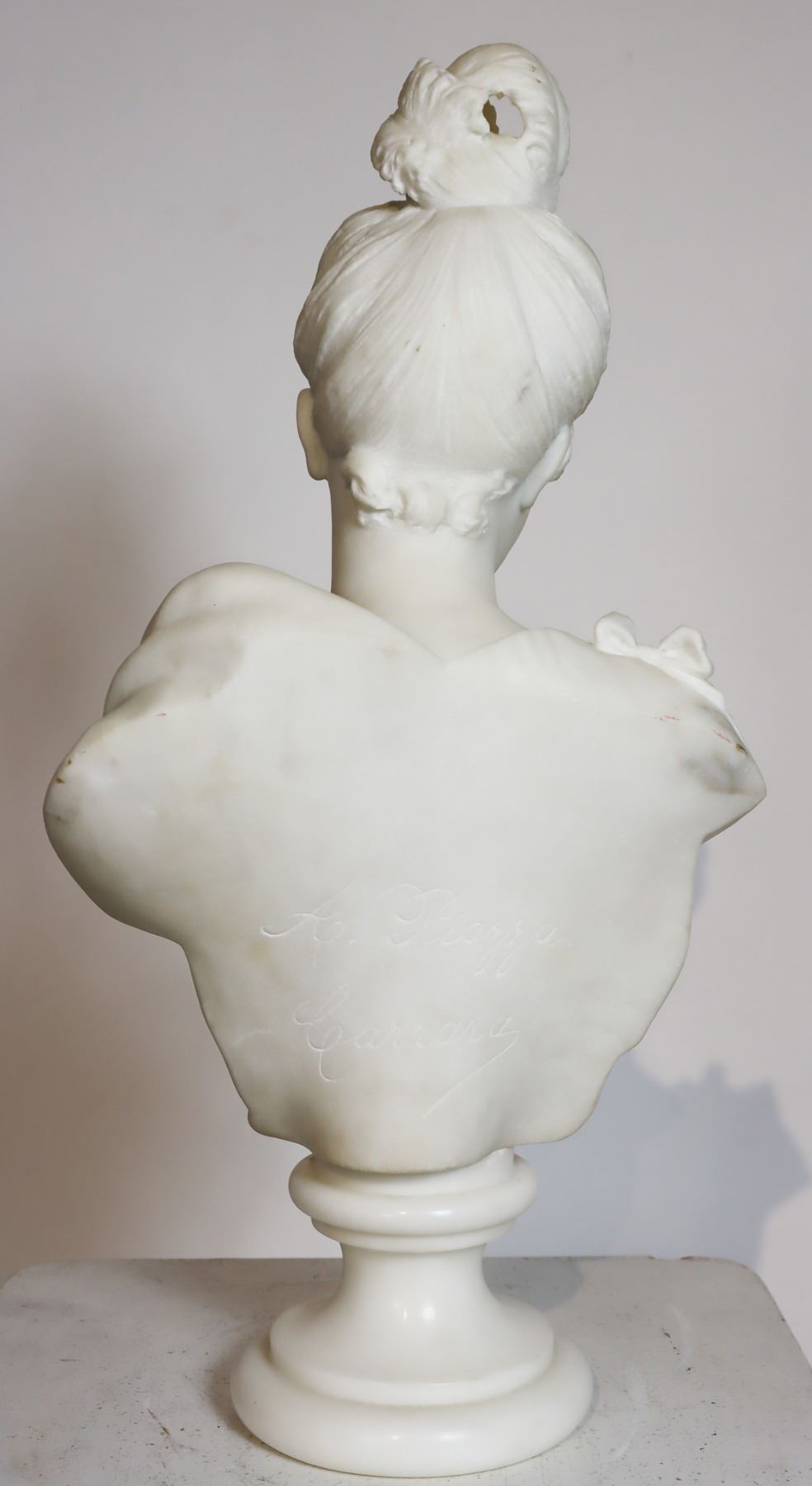 Carrara marble bust of a beautiful young woman, gorgeous piece of heavy sculpture, signed A. Piazza, Carrara. Excellent condition, marble plinth is separate from sculpture.