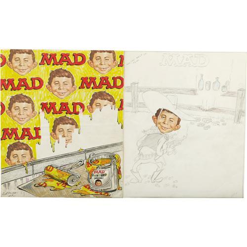 <B>Antonio Prohias - Mad Cover Preliminary Original Art, Group of 2 (circa 1969).</B></I> Visual puzzles were always a mainstay of <B>Mad</B></I>,<B> </B></I>and Antonio Prohias was a master at designing them. The wall paint idea finally saw print on the cover of <B>Mad </B></I>#148 in 1972. Each mixed-media cover gag has an overall size of 14" x 17", and the art averages Very Good condition.<BR><BR><b>Shipping:</b> Flat Material, Small (<a target="_blank" href="http://www.heritageauctions.com/common/shipping.php">view shipping information</a>)