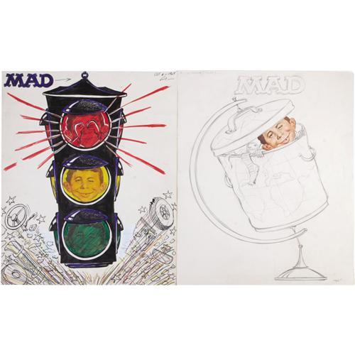 <B>Antonio Prohias - Mad Cover Preliminary Original Art, Group of 2 (circa 1969).</B></I> All systems are go, with these two outrageous <B>Mad </B></I>cover concepts by Antonio Prohias. Each mixed-media piece has an overall size of 14" x 17", and the art averages Very Good condition.<BR><BR><b>Shipping:</b> Flat Material, Small (<a target="_blank" href="http://www.heritageauctions.com/common/shipping.php">view shipping information</a>)
