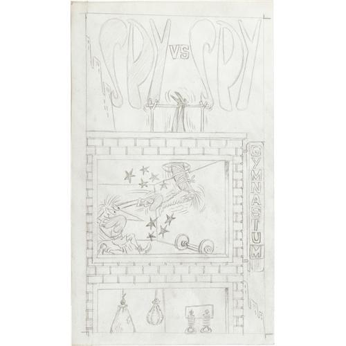 <B>Antonio Prohias - Spy vs Spy Cover Preliminary Original Art (EC, circa 1970).</B></I> Thanks to the Black Spy, the White Spy has perfected his boxing workout. This hard-hitting, penciled cover gag has an approximate overall size of 7.5" x 12.5", and its condition is in Excellent.<BR><BR><b>Shipping:</b> Flat Material, Small (<a target="_blank" href="http://www.heritageauctions.com/common/shipping.php">view shipping information</a>)