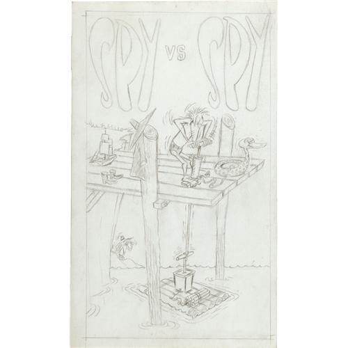 <B>Antonio Prohias - Spy vs Spy Cover Preliminary Original Art (EC, circa 1970).</B></I> When in comes to intrigue, the Black and the White Spy make the espionage game more of a "way-out-trigue!" Thanks to the White Spy, the Black Spy is about blow up far more than just his toy float. This cataclysmic cover scene has an approximate overall size of 7.5" x 12", and the art is in Excellent condition.<BR><BR><b>Shipping:</b> Flat Material, Small (<a target="_blank" href="http://www.heritageauctions.com/common/shipping.php">view shipping information</a>)
