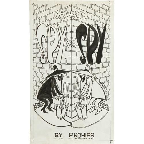 <B>Antonio Prohias - Unpublished Spy vs Spy Cover Original Art (EC, circa 1968).</B></I> The world's Mad-est spies, the Black Spy and the White Spy have their wires crossed for this explosive scene, slated for an unpublished paperback cover. This "spy-tacular" drawing has an approximate overall size of 7" x 12", and the art is in Excellent condition.<BR><BR><b>Shipping:</b> Flat Material, Small (<a target="_blank" href="http://www.heritageauctions.com/common/shipping.php">view shipping information</a>)