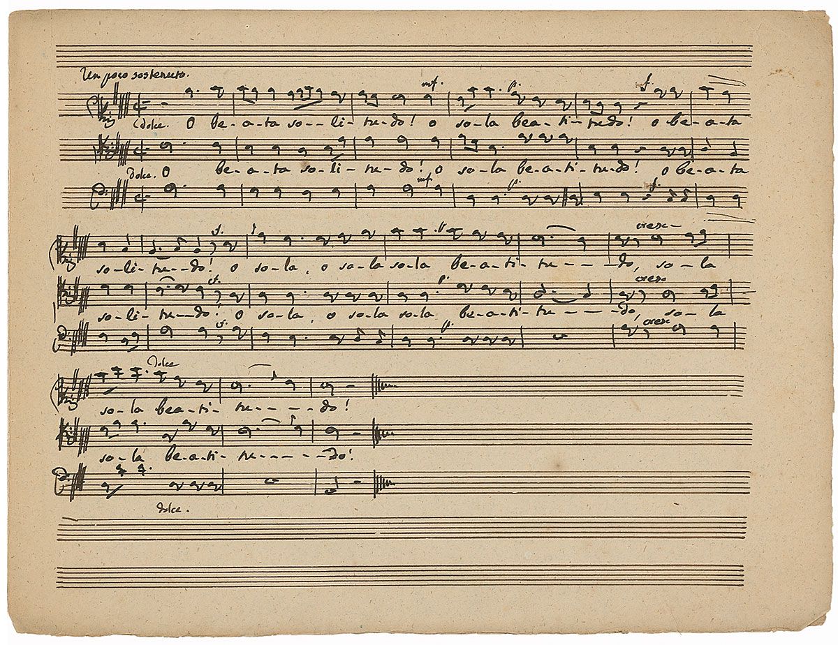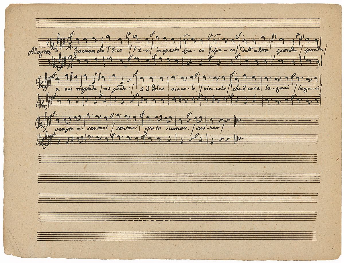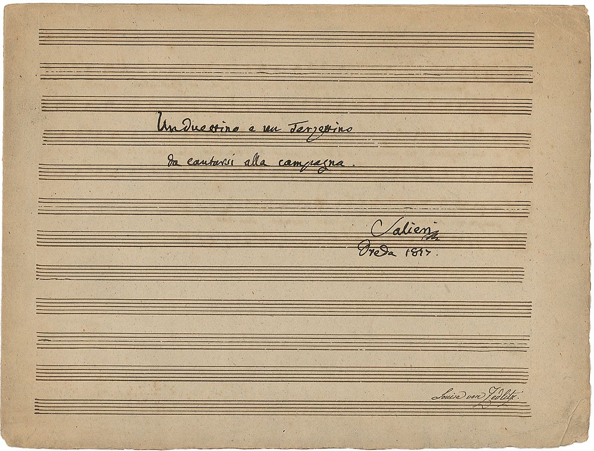 Venetian composer and conductor (1750–1825). As the Austrian imperial Kapellmeister from 1788 to 1824, he was one of the most important and famous musicians of his time. Signed autograph musical manuscript on two 12.5 x 8.5 musically lined sheets. On the front page Salieri writes, “Un duettino e un Terzino da cantarsi alla campagna, Salieri,” and the date of 1817. Inside manuscript contains two vocal pieces, 38 bars of music and lyrics overall, including a duet for two soprano voices (in 3 two-line systems) and a trio for soprano, alto, and basso voices (in 3 two-line systems). Front cover also bears an ownership signature of Louise von Zedlitz. In fine condition, with some mild toning. A phenomenal musical piece from the highly esteemed Salieri.