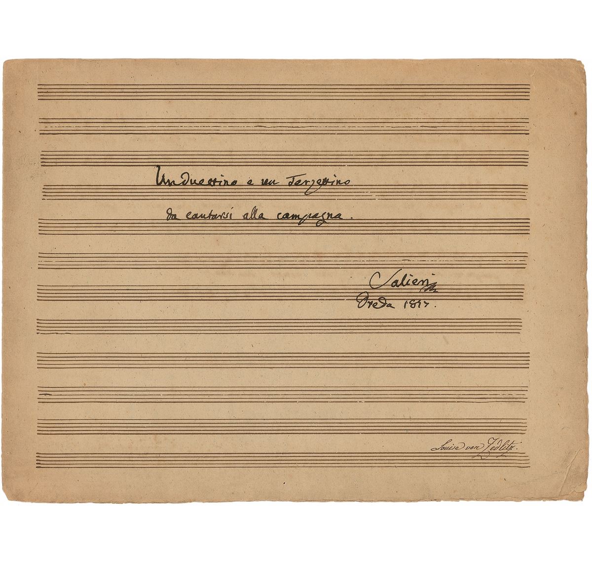 Venetian composer and conductor (1750–1825). As the Austrian imperial Kapellmeister from 1788 to 1824, he was one of the most important and famous musicians of his time. Signed autograph musical manuscript on two 12.5 x 8.5 musically lined sheets. On the front page Salieri writes, “Un duettino e un Terzino da cantarsi alla campagna, Salieri,” and the date of 1817. Inside manuscript contains two vocal pieces, 38 bars of music and lyrics overall, including a duet for two soprano voices (in 3 two-line systems) and a trio for soprano, alto, and basso voices (in 3 two-line systems). Front cover also bears an ownership signature of Louise von Zedlitz. In fine condition, with some mild toning. A phenomenal musical piece from the highly esteemed Salieri.