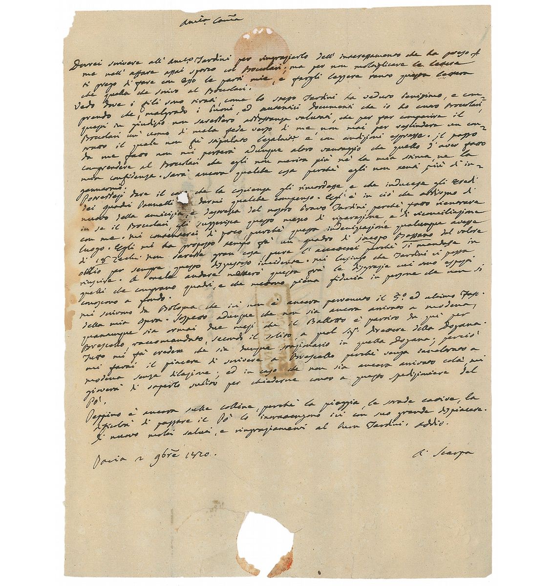 Italian anatomist (1752–1832) who wrote several important treatises on a wide range of anatomical and medical subjects. Scarce ALS in Italian, signed “A. Scarpa,” one page, 7.5 x 10, November 2, 1820. Letter discussing the printing of one of his works and the difficulty of buying paintings. In part (translated): “Some time ago I proposed a picture of Jacopo Bassano worth 18 gold pieces…I consider this one of the misfortunes those who buy paintings are accustomed to, and that put full confidence in people who do not understand.” In very good condition, with paper loss to the bottom from seal removal and a few tape-repaired tears to this area, show-through from the seal at the top and an ink postmark stamp to reverse, a small hole to the center (affecting a few words), slight paper loss to one corner, and light dampstaining to left edge.