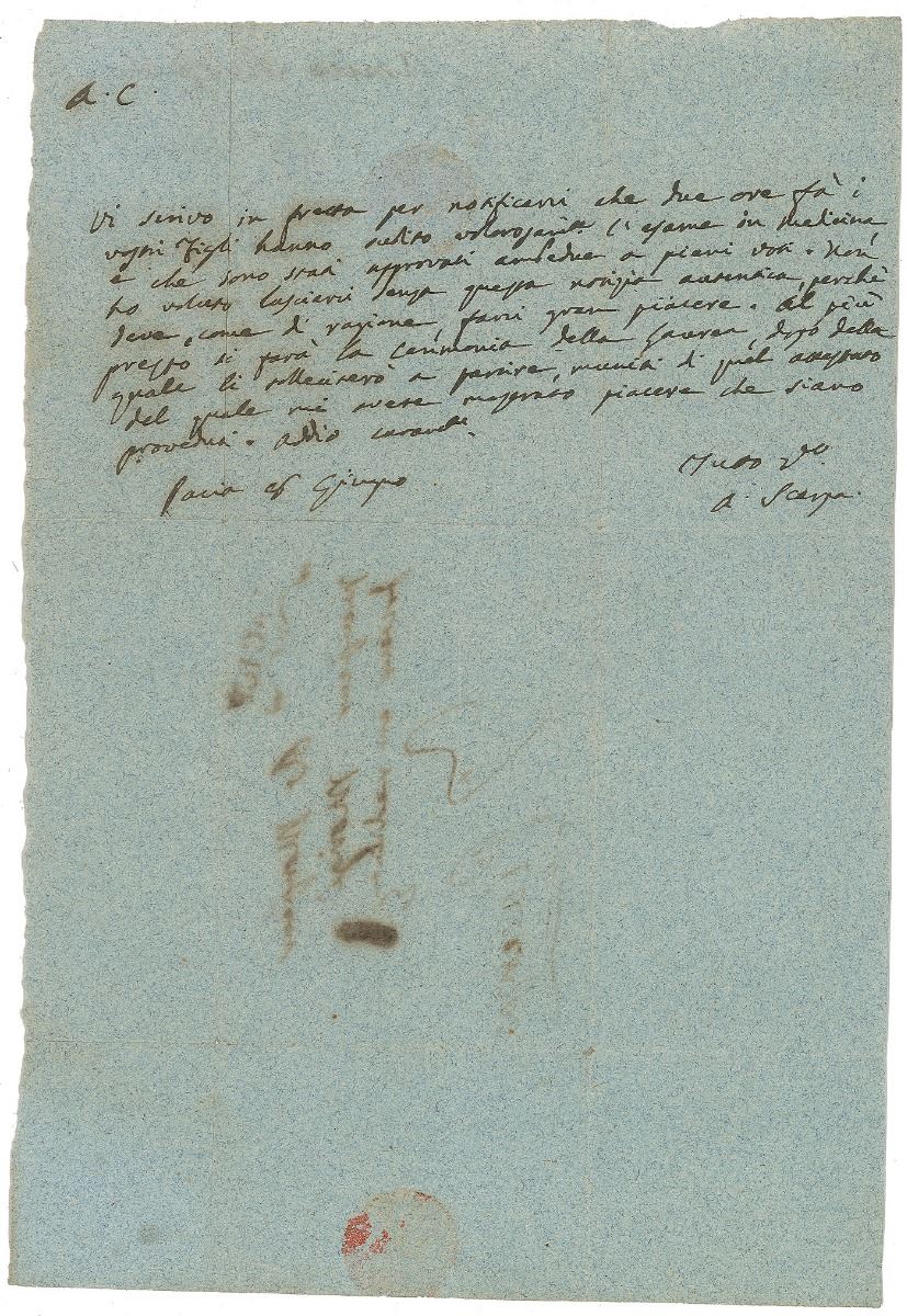 Italian anatomist (1752–1832) who wrote several important treatises on a wide range of anatomical and medical subjects. ALS in Italian, signed “A. Scarpa,” one page, 6.75 x 10, no date. Untranslated letter to Nicola Morigi. In fine condition, with writing showing through from the address panel on the reverse.