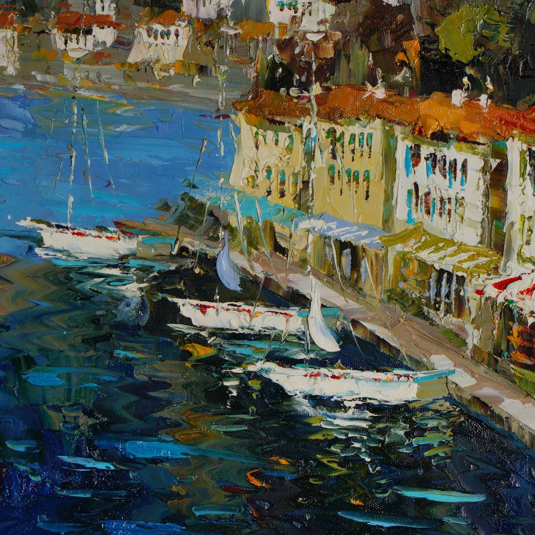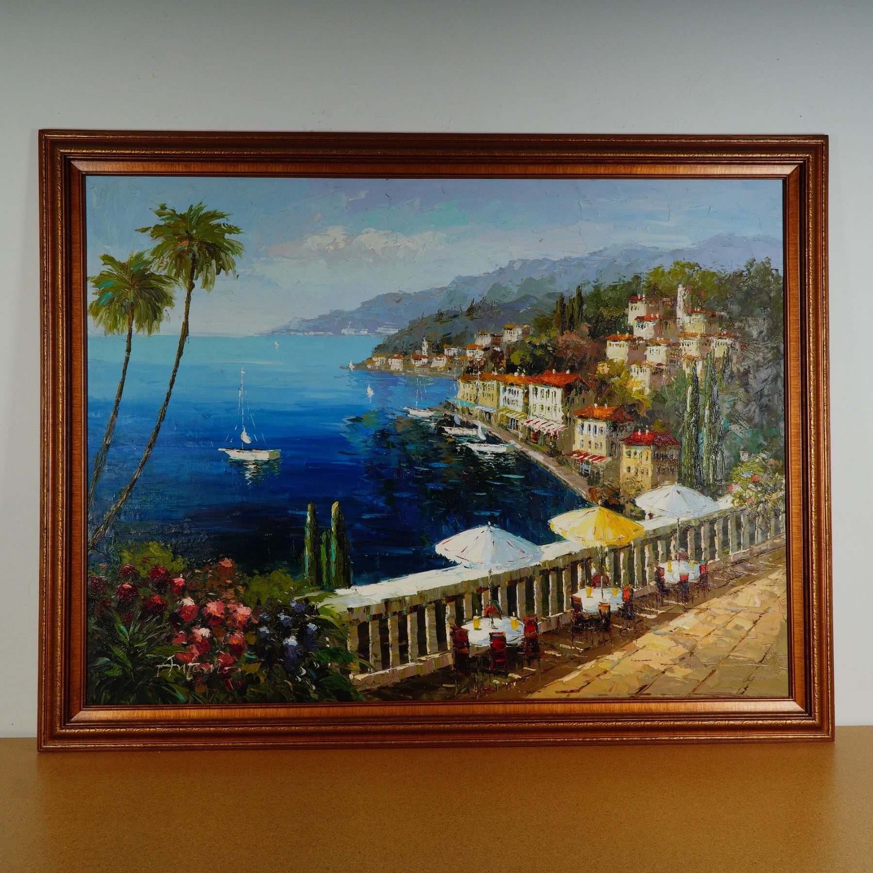 A dazzling oil on canvas by Italian artist Antonio Di Viccaro. This sweeping coastal composition depicts a sunlit Mediterranean promenade lined with elegant cafes shaded by bright umbrellas, where tables await overlooking the sparkling blue sea. Palm trees rise gracefully to the left, framing the vibrant town with its terracotta rooftops and colorful buildings that cascade along the shoreline. Yachts and sailboats dot the tranquil waters, their reflections rippling across the harbor. Executed with Di Viccaro's hallmark impasto technique, the work is alive with thick, energetic brushstrokes and a radiant palette that conveys both warmth and atmosphere. Antonio Di Viccaro is a renowned Italian painter celebrated for his romantic depictions of Mediterranean seascapes, harbor towns, and flower-draped terraces. His signature use of impasto creates an engaging texture and vibrancy, bringing to life the romance of Italy's coastal villages. Di Viccaro's paintings are sought after for their ability to transport the viewer to sun-drenched locales where color, light, and movement merge into an idyllic vision. Signed lower left Antonio.
