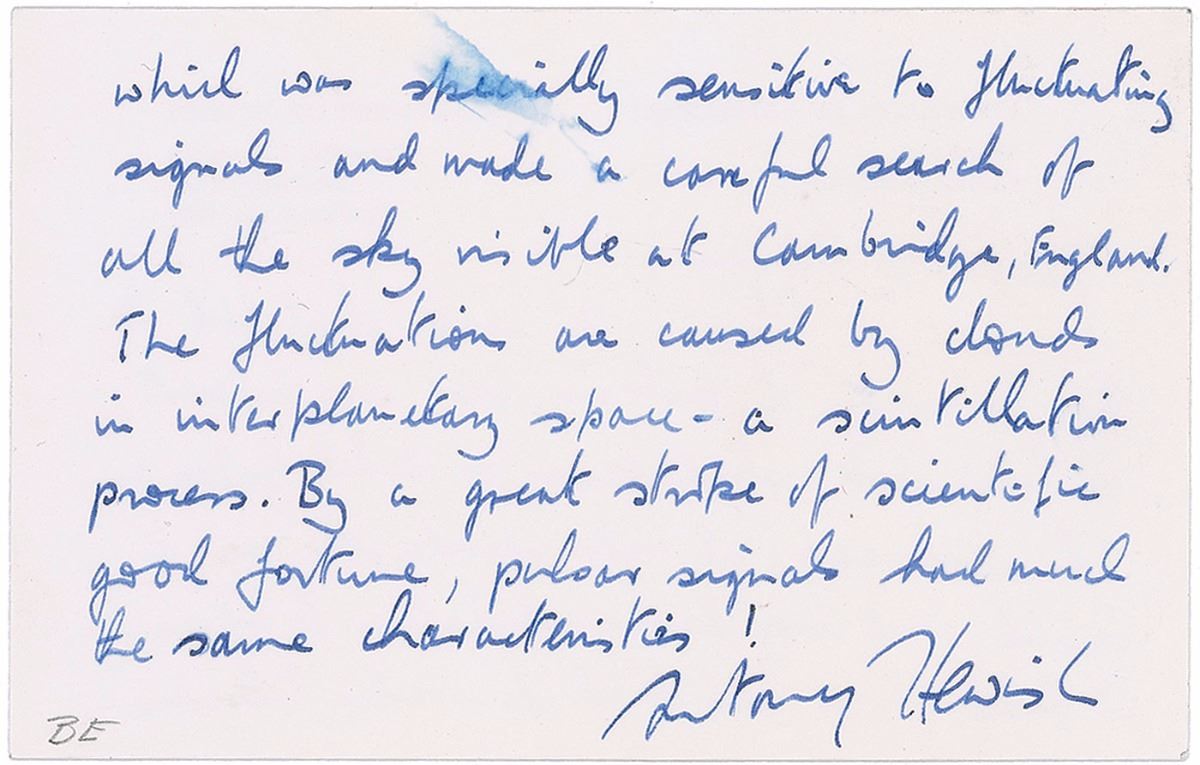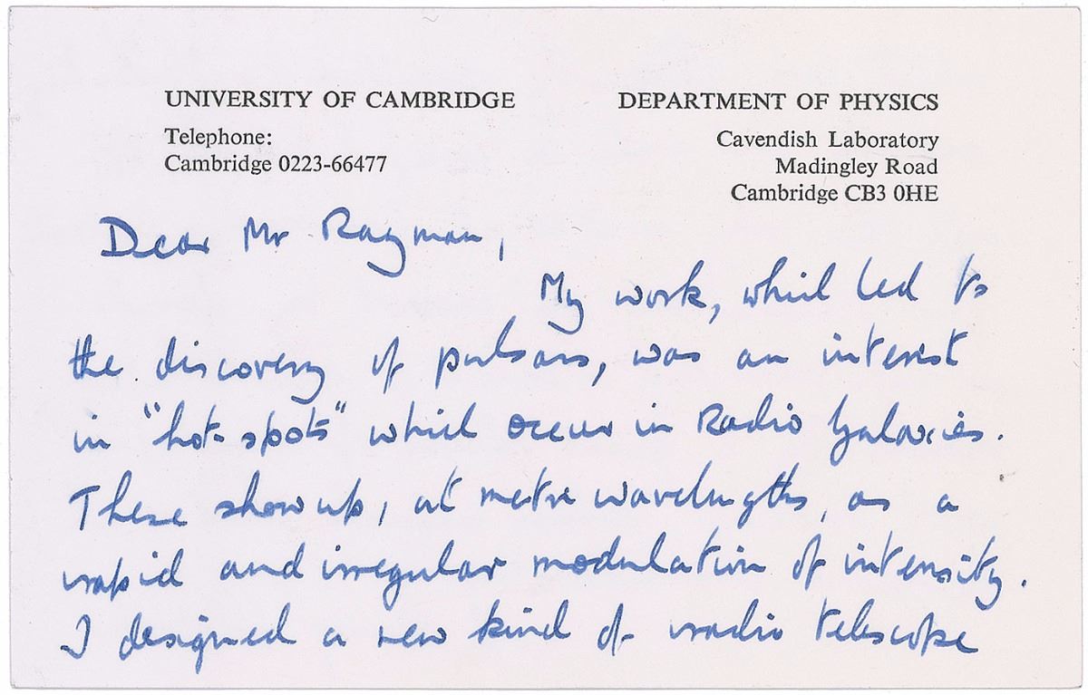 British radio astronomer (born 1924) who won the Nobel Prize for Physics in 1974 for his work on the development of radio aperture synthesis and its role in the discovery of pulsars. ALS, one page both sides, 5.5 x 3.5, Cambridge University, Cavendish Laboratory stationery card, postmarked January 20, 1976. Fascinating letter describing the work that led to his recent Nobel Prize. In part: “My work, which led to the discovery of pulsars, was an interest in ‘hot-spots’ which occur in Radio Galaxies. These show up, at metre wavelengths, as a rapid and irregular modulation of intensity. I designed a new kind of radio telescope which was specially sensitive to fluctuating signals and made a careful search of all the sky visible at Cambridge, England. The fluctuations are caused by clouds in interplanetary space…By a great stroke of scientific good fortune, pulsar signals had much the same characteristics!” In fine condition, with significant brushing to a single word. Accompanied by the original mailing envelope addressed in his own hand, as well as a carbon copy of the original letter sent to him.