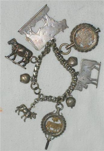 Interesting European sterling (marked sterling on clasp) bearing 9 silver charms: 3 Montreux cowbells, 4 various size cow fobs, 2 interlocking cow design keys, very unusual. C1940. (22-4)
