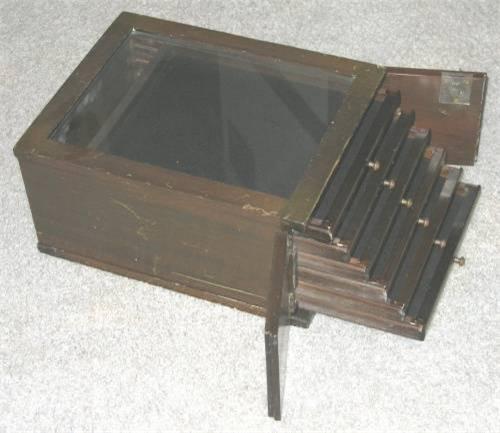 Outstanding c1920's locking mahogany/walnut jewelry display/salesman box. Glass top for viewing. 6 trays store beneath top tray ready for display. 7.25"tx11.75"w. (5-180)