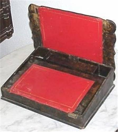 Circa 1880 Faux-tortoise, papier mache & composite traveling writing box/slope. Brass fittings. NOTE: All hinges have separated, requires repair. 3.5"t x 13"w. 6lbs (7-4)