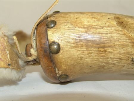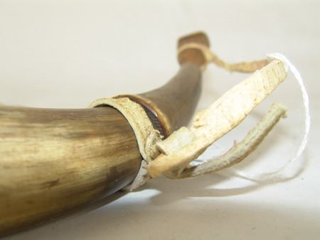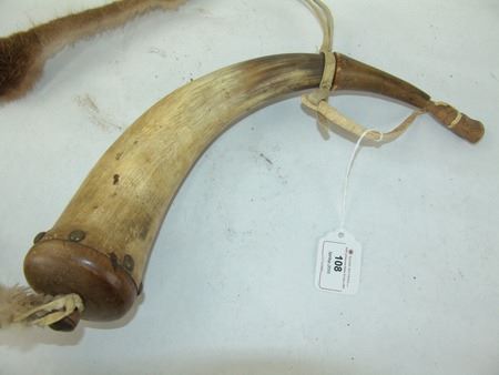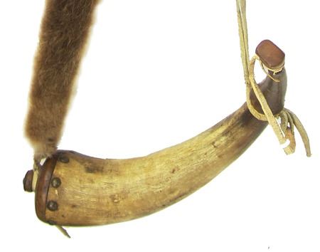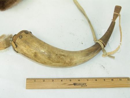 Late 1800s, Great old hand carved buffalo horn container with carved wooden spout and cap, brass tacks, and newer non-original strap. Very good condition. 14" long + handle
