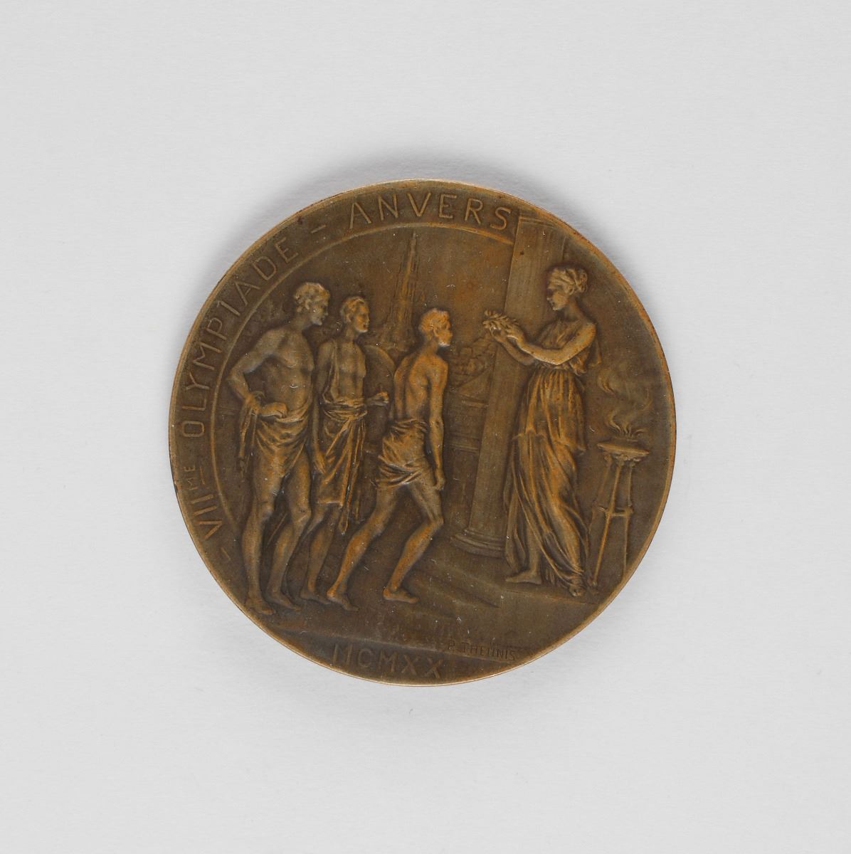 Uncommon participation medal issued for the Antwerp 1920 Summer Olympics. Bronze, 60 mm, 75 gm, by Pierre Theunis. The front depicts a dramatic image of a flying Victory crowning a charioteer on biga; the reverse features Nike standing before a burning censer and crowning a trio of victorious athletes, with Antwerp in the background and raised text, “VIIme Olympiade–Anvers, MCMXX.” An aesthetically impressive Olympic medal.