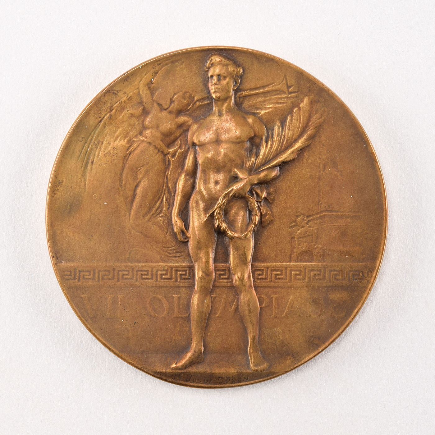 A total of 29 nations attended the VII Olympiad in Antwerp, Belgium, with Hungary, Germany, Austria, Bulgaria, and the Ottoman Empire all banned from competing due to their involvement in World War I and the cancelation of the 1916 Summer Games. In spite of such political unrest, the return of the Games debuted a trinity of enduring Olympic traditions: the voicing of the Olympic Oath, the symbolic release of doves, and the initial flying of the Olympic flag. An exceptional third place medal of the utmost historical interest.