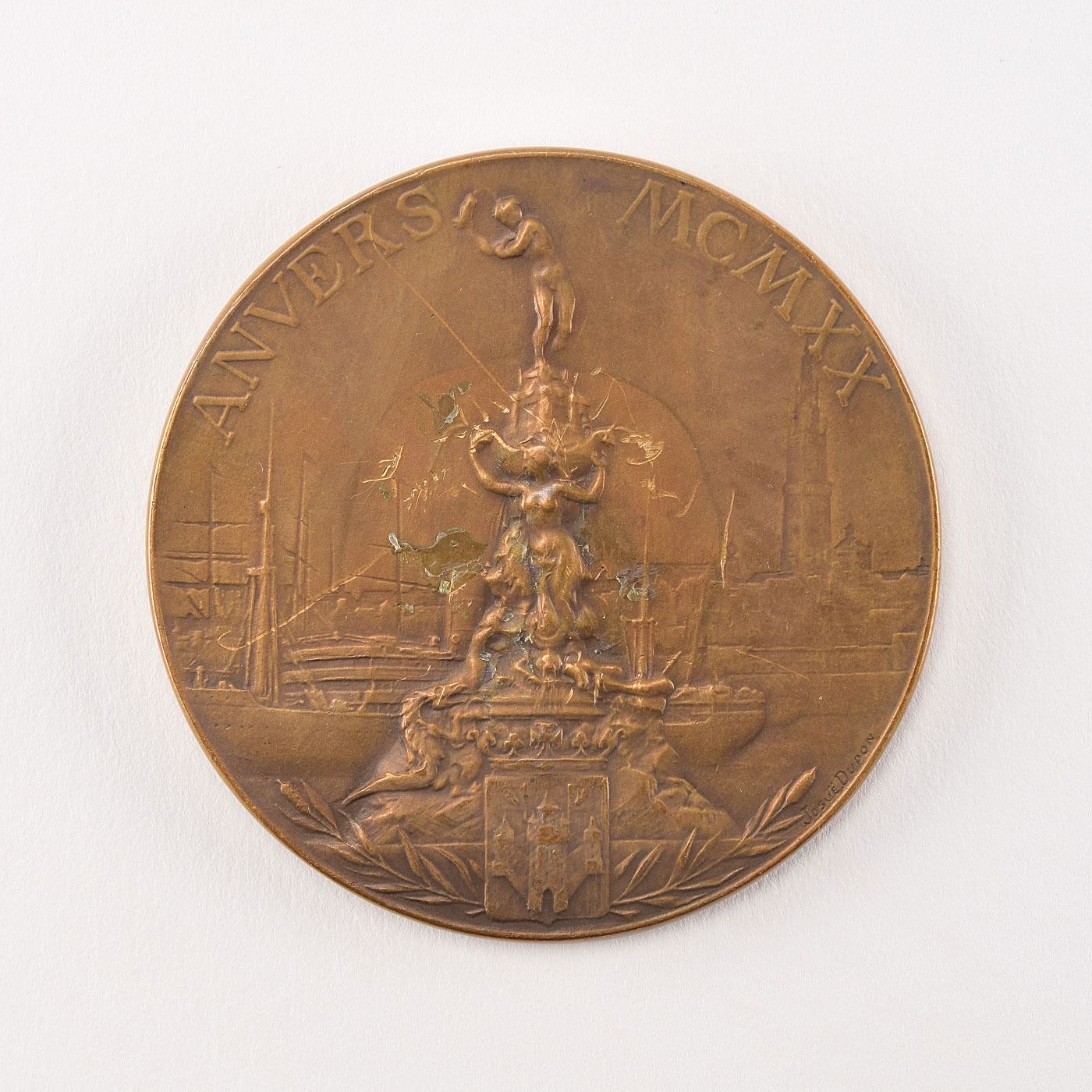 Sought-after winner's medal issued for the Antwerp 1920 Summer Olympics. Bronze, 60 mm, 81 gm, by Josue Dupon. The front shows a victorious athlete holding a laurel wreath and palm branch, with a statue of Renommee in the background, inscribed "VII Olympiade"; the reverse depicts the Brabo fountain above the Antwerp shield, with the Cathedral of Our Lady and city looming in the background, inscribed above, "Anvers MCMXX."