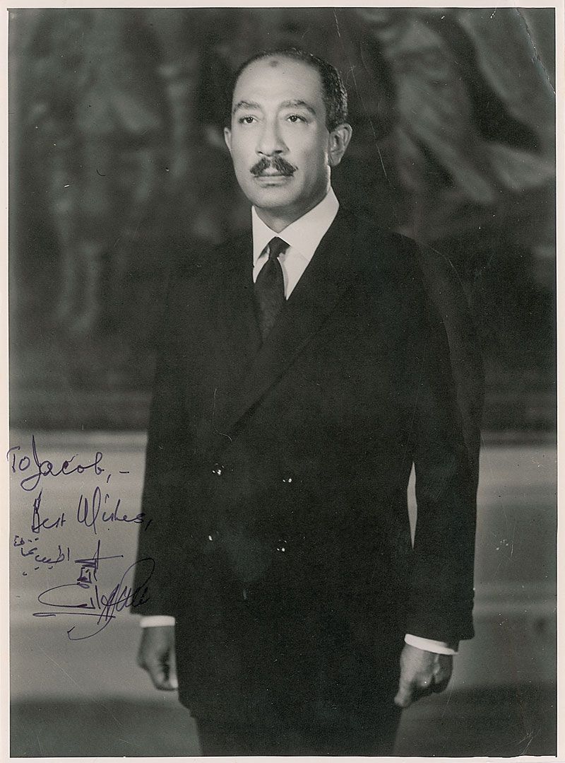 Matte-finish 7 x 9.25 portrait, signed and inscribed in black felt tip, “To Jacob—Best Wishes, Anwar Sadat.” In very good condition, with a noticeable diagonal crease passing through the right side of the photo, and other scattered creases. Accompanied by a letter of transmittal from Sadat’s office and the original mailing envelope.