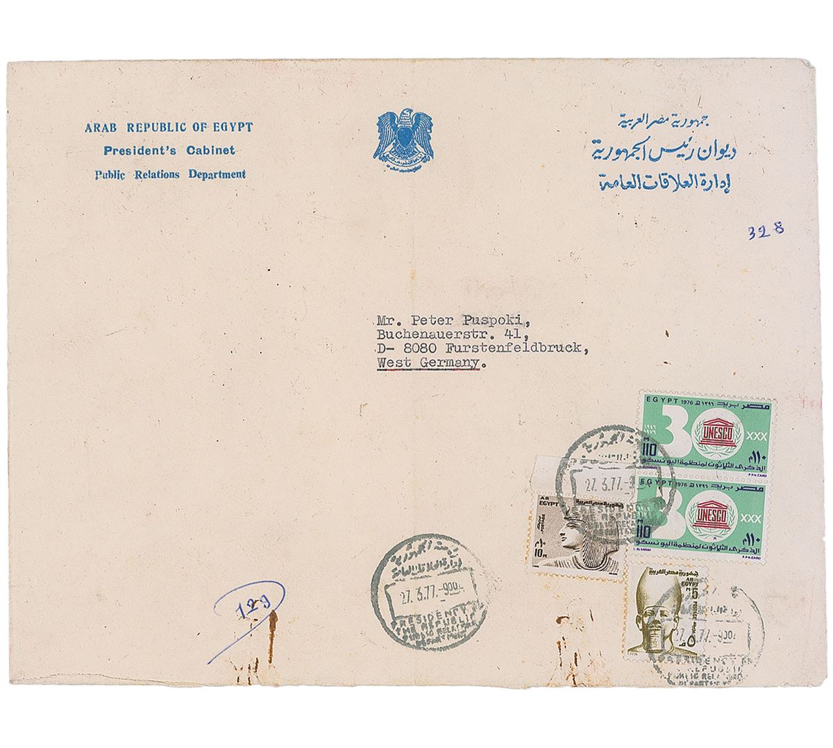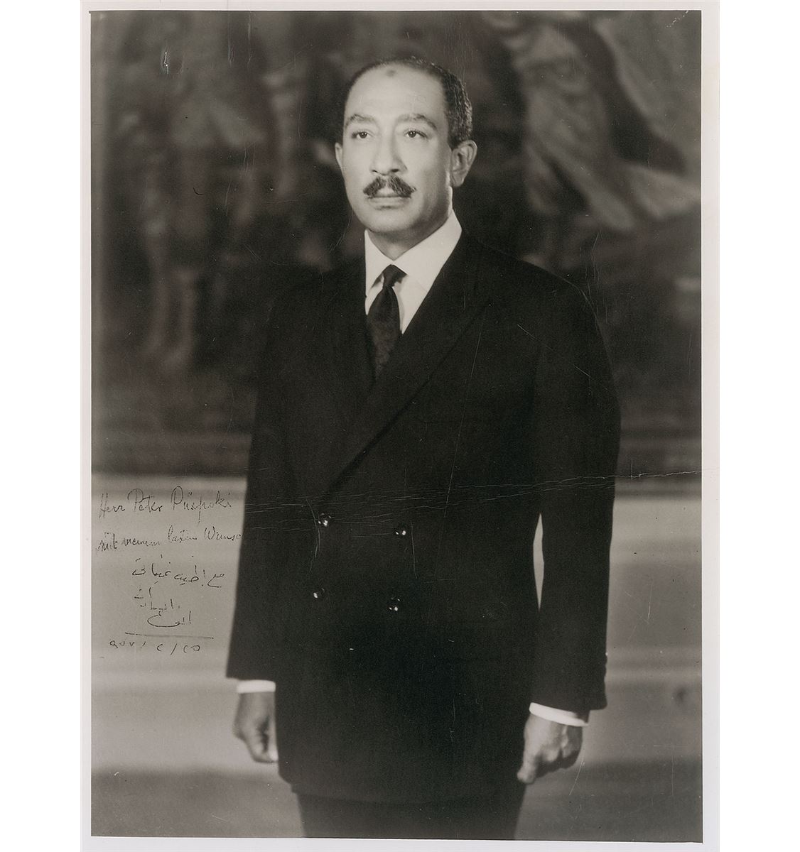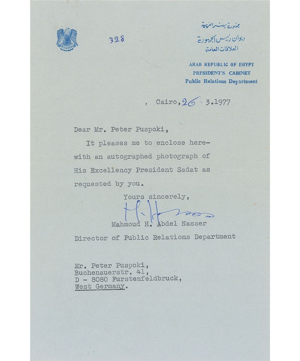 Matte-finish 7 x 9.5 photo of President Sadat in a suit and tie, signed and inscribed in black ink in German and Arabic. In very good condition, with central horizontal creasing (affecting a portion of the inscription), a pair of paperclip impressions to top edge, and irregular ink adhesion. Accompanied by the original mailing envelope and letter of transmittal, dated March, 26, 1977.