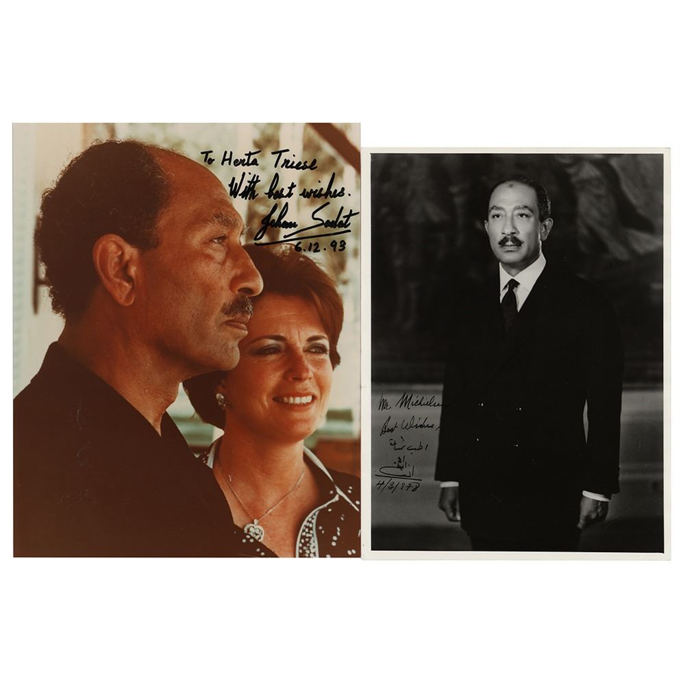 Two photos: a matte-finish 7 x 9.5 photo of Anwar Sadat in a formal pose, signed and inscribed in black ink, "Mr. Michielsen, best wishes," adding his name in both English and Arabic with the date, "4/3/978"; and a color semi-glossy 8 x 10 photo of the Sadats, signed and inscribed in black felt tip, "To Herta Triese, with best wishes, Jehan Sadat, 6.12.93." In overall very good to fine condition, with some light creasing to the Anwar photo.