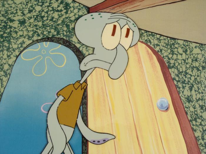 This animation cel and reproduction background are from the Nickelodeon TV show SpongeBob Squarepants. The story takes place under the deep blue sea in Bikini Bottom, where SpongeBob resides. SpongeBob, who is a yellow, porous sponge, is your typical happy-go-lucky character, as he is always cheerful and enjoys making people laugh. Patrick Star, SpongeBob's neighbor who is a starfish, is your average children's show idiot, as he boasts knowing nothing and is often getting himself into ridiculous situations. Between the homes of these two lies the home of the miserable Squidward, a squid, who is known for being grouchy and playing tricks on SpongeBob and Patrick. Both SpongeBob and Squidward work at the Krusty Krab, a fast food business run by the greedy money-loving Mr. Krabs, a crab, the arch rival of the evil, possibly misunderstood, Plankton. Another neighbor, Sandy Cheeks, an athletic squirrel who normally wears an astronaut's space suit, was introduced in "Tea at the Treedome." She spends most of her time inventing and experimenting. * Squidward looks anxious. * Original Printed Background and Animated Cel Overall Size of Background: 11" x 17" Overall Size of the Cel: 10 1/2" x 12 1/2" Very good condition This is an original hand-painted cel set-up used in the production of an episode of "SpongeBob SquarePants." Each one-of-a-kind set-up represents a slight change in position of the characters. When individually photographed and projected in rapid succession, the images appear to move. * To create production cels, the original animator's drawing is transferred onto an acetate cel (by hand-inking and/or photo copying). The cel is then hand-painted on the reverse side. The background accompanying this set-up is a reproduction background. * The printed background is ready to be matted and framed. There is some slight paint fade to Squidward's outline. *