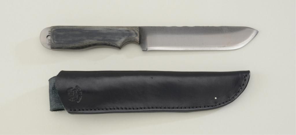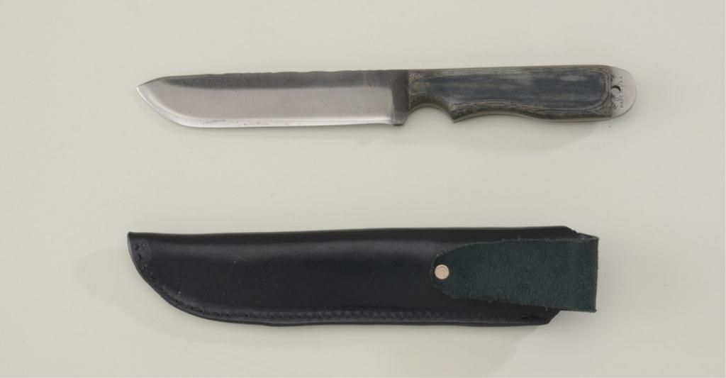 Anza custom knife with leather sheath, approx. 11” overall with an approx. 6-1/2” blade in fine condition, made from a high carbon steel file showing micarta grip; top rib of blade marked “Anza USA ‘11’”; a highquality custom knife with heavy belt sheath. Est.: $75-$150.
