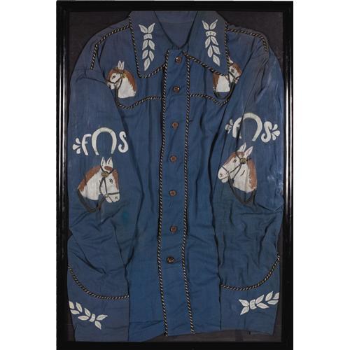 <B>"Apache Ambush" Costume Shirt.</B></I> An elaborate Western shirt worn by a cast member in the 1955 B-grade Western. In Excellent condition, framed to an overall size of 21" x 31". In Very Fine condition with some areas of discoloration.<I>From the Robert Johnson Memorabilia Collection.</B></I><BR><BR><b>Shipping:</b> Framed - with Glass, Medium (<a target="_blank" href="http://www.heritageauctions.com/common/shipping.php">view shipping information</a>) <BR><BR><B>Important notice:<