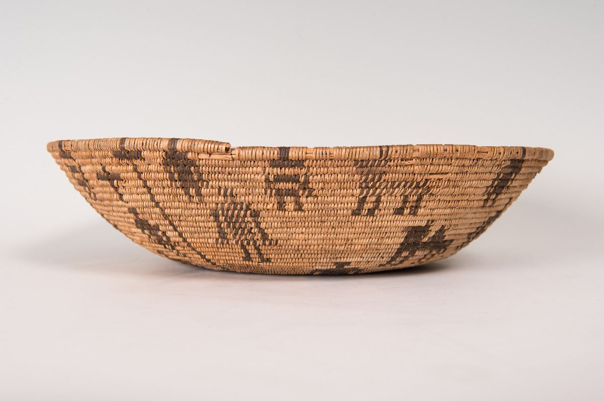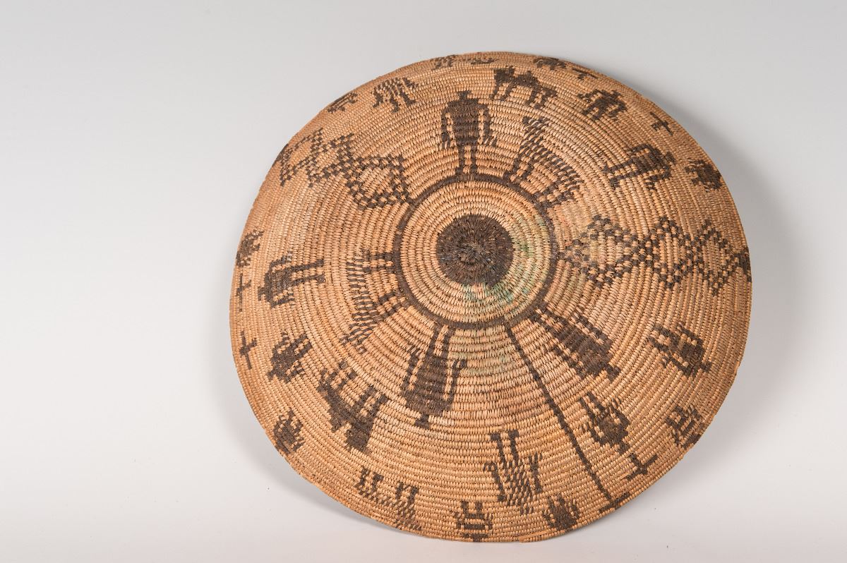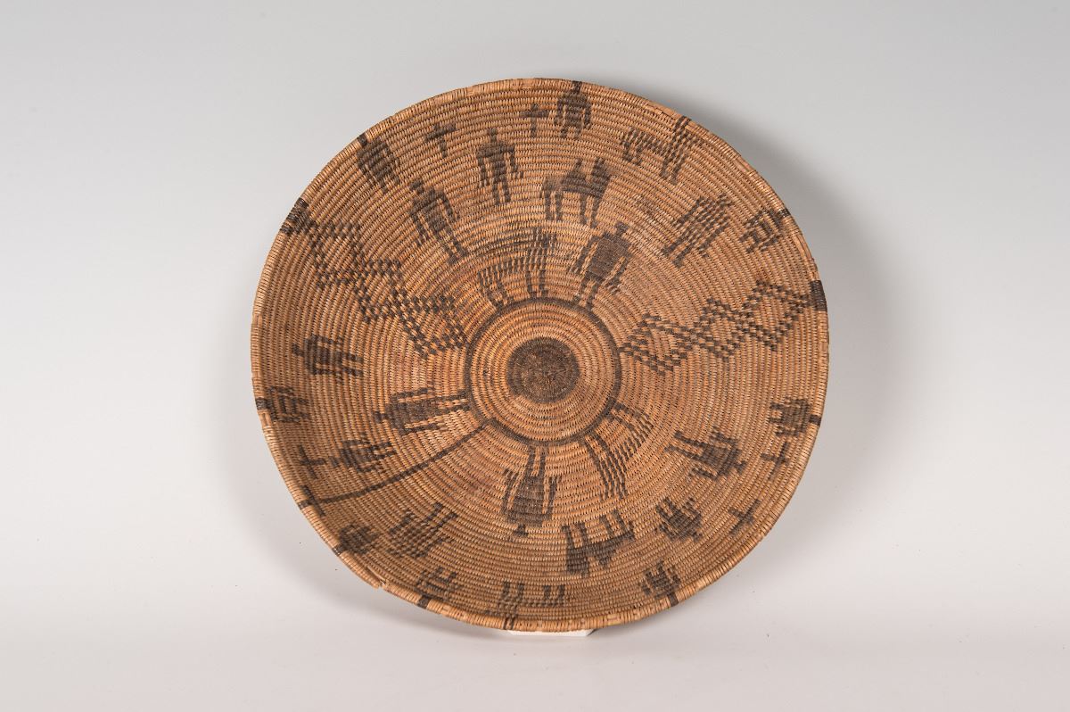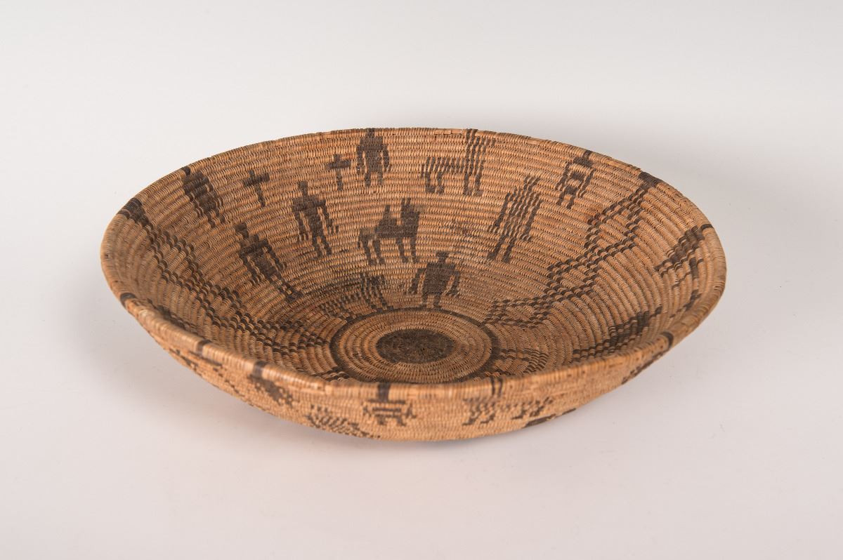 Apache Basket. 13" x 3" polychrome basket with 2 camels, 4 dogs, 17 human figures, and cross designs. Circa 1920s.