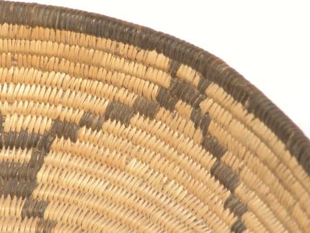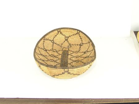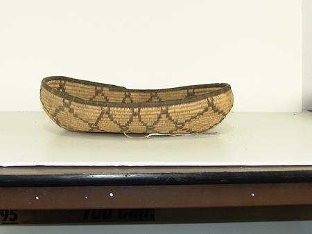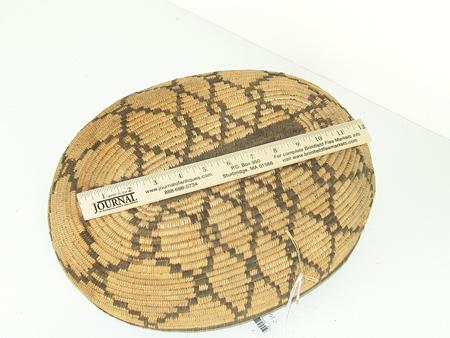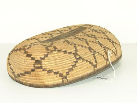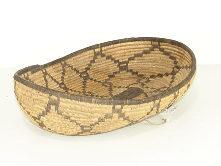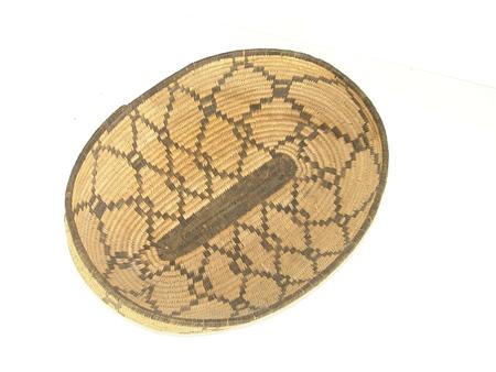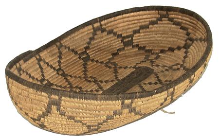 Circa 1940s, Rare oval shaped basketry bowl with traditional X/diamond designs. Very good condition. 3-1/2" x 11" x 14" From the Johnson Collection.