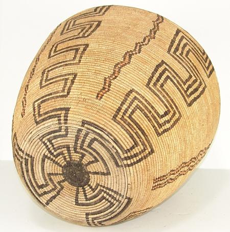 Circa 1920s, Huge woven basketry olla with polychrome snake symbols and other traditional geometric forms. Sturdy and intact but a few rows have missing stitches. 19" x 16"