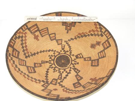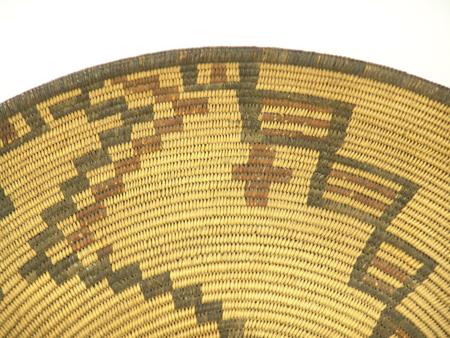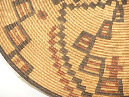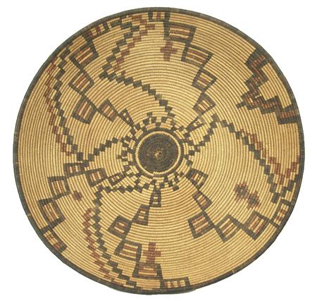 Circa 1930s, Fantastic large polychrome basketry tray with intricate stepped design with graduated boxes, crosses, and other symbols. Very good condition. 3" x 16-1/4"