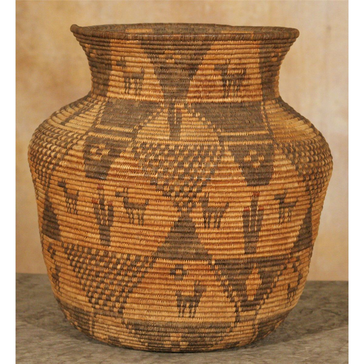 Apache Olla. 14" tall, 12" wide basketry olla with wonderful pictorial designs of dogs and cacti. Circa 1910.