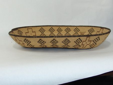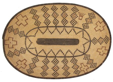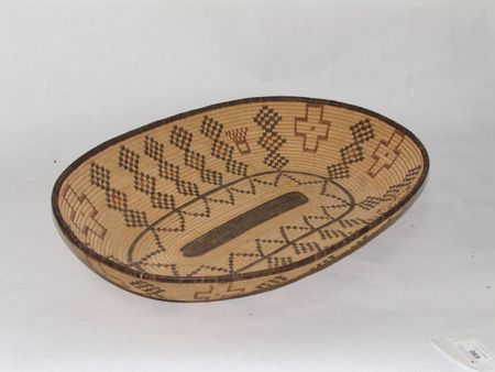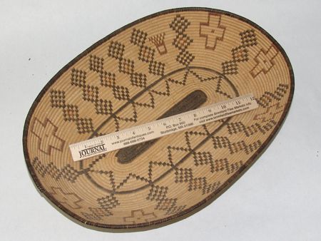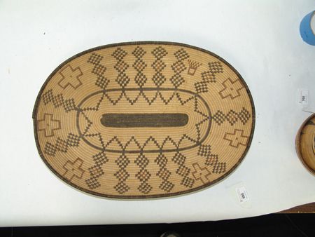 Ca. 1940s, Outstanding large oval tray with intricate polychrome designs containing crosses, and checkered diamonds. Very good condition. 3" x 18" x 12-3/4"