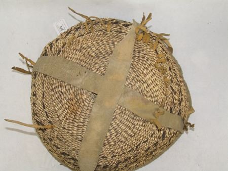 Ca. 1970s, Unique bowl-shaped twined burden basket with traditional leather trim. Good condition. 9" x 15"