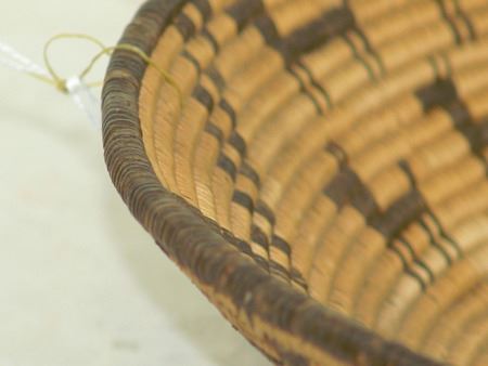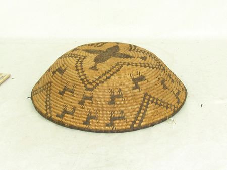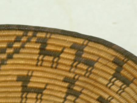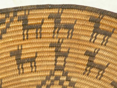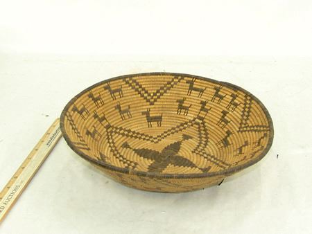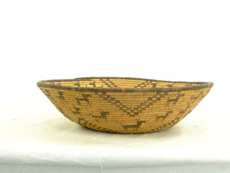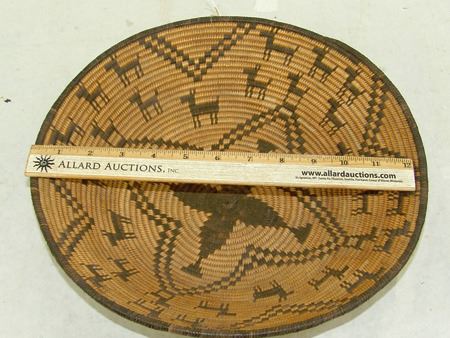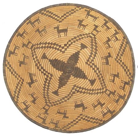 Ca. 1930s, Outstanding tight weave tray with traditional blossom/cross center and loaded with dog/animal figures and geometric designs. 3" x 12"